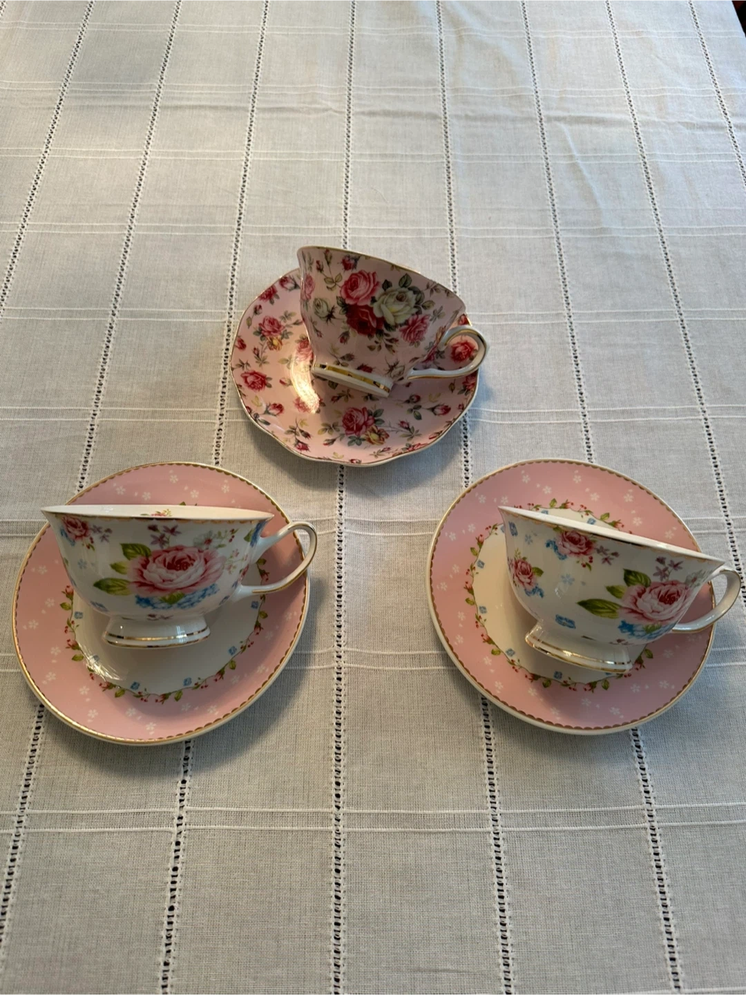 253Beautiful set of 3 vintage-style teacups with matching saucers. Features delicate pink rose patterns and gold trim . Perfect for tea time, display, or gifting. All in excellent condition.