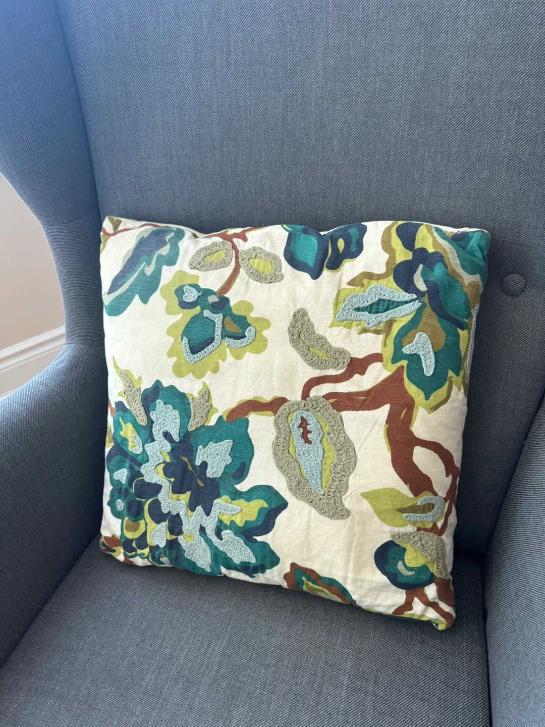 A lovely throw pillow with a vibrant floral design! It's in good condition and would add a pop of colour to any room. The colours include shades of green, blue, and brown on a cream background. Perfect for your couch or bed!