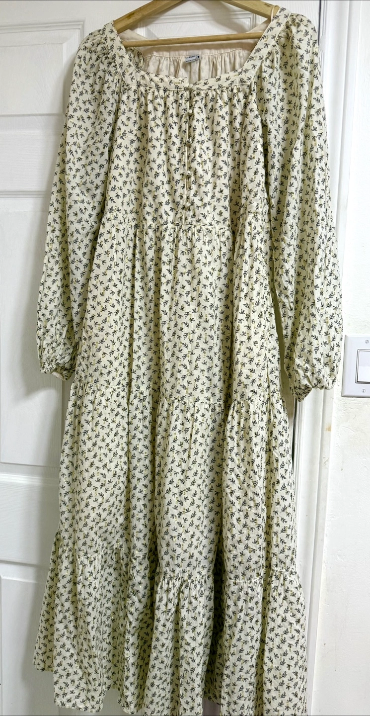74Here's a lovely floral tiered dress! It features a square neckline and long sleeves. Perfect for a casual day out or a cozy evening in