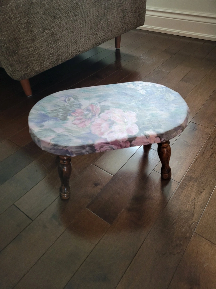 These vintage floral wood step stools are perfect for adding a touch of retro charm to your home! * Floral patterned upholstery * Wooden legs * Compact size for easy storage One has a cushioned top. * Ideal for various uses around the house These delightful stools are priced at $25 ea, Firm Fennell and Upper gage Hamilton Please click on my many ads for sale