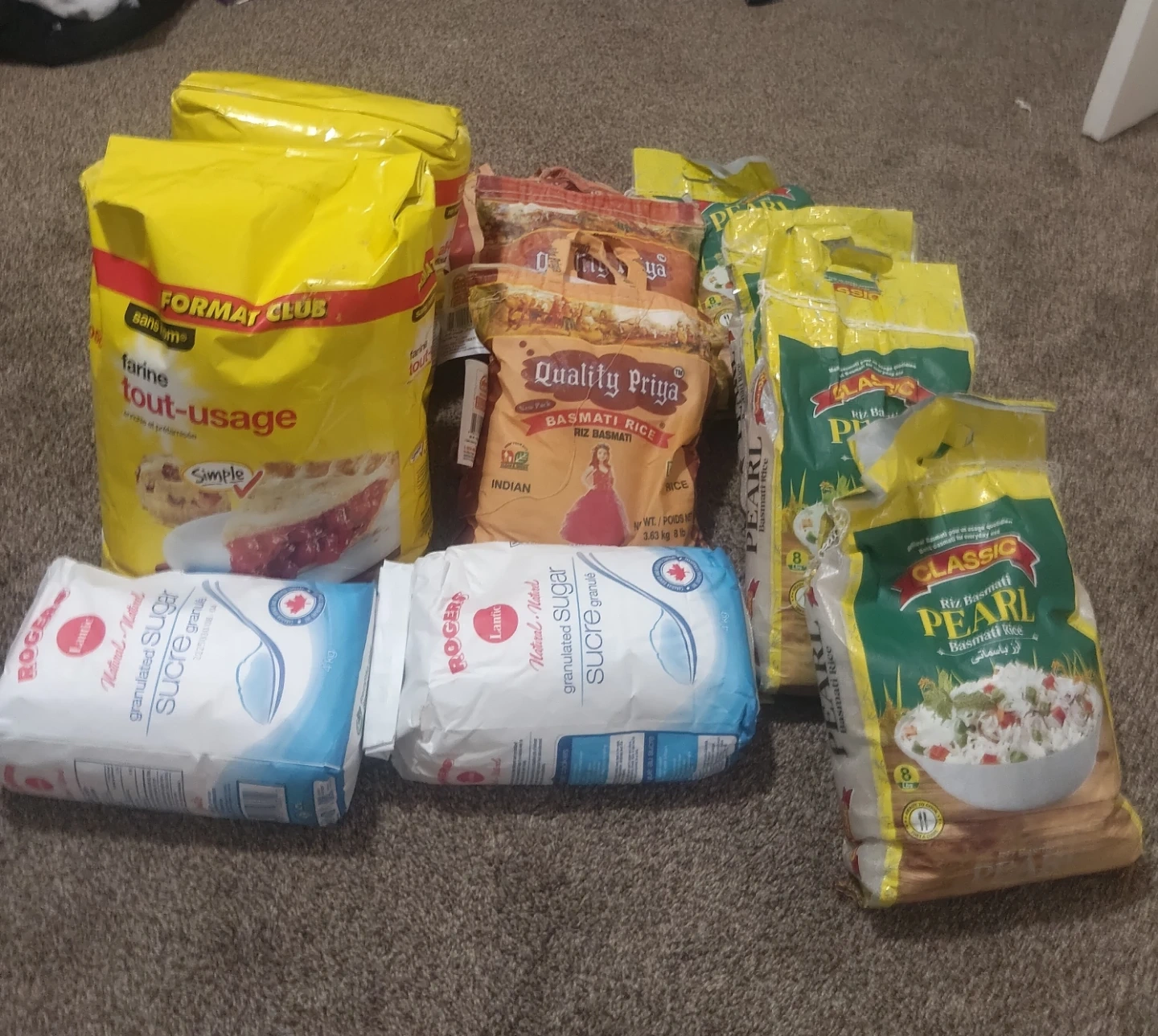 77🌾 HUGE Pantry Stock-Up Lot! Flour, Sugar, and Premium Basmati Rice – HALF PRICE! 💰 Selling 11 brand new, sealed bags of bulk pantry staples. Perfect for stocking up—get incredible savings! Selling ALL 11 bags at half the estimated current store price. THE LOT INCLUDES (Total 11 Bags) • 2 Bags of All-Purpose Flour (10 \text{ kg} each) • 2 Bags of Granulated White Sugar (4 \text{ kg} each) • 7 Bags of Premium Basmati Rice (Golden Pearl & Quality Priya, \sim 3.6 \text{ kg} each) YOUR UNBEATABLE PRICE Estimated retail value is \sim \text{\$142.00}. Selling Price (Half Price): \text{\$71.00} 🎁 SPECIAL DEAL: Take an extra \text{\$10} OFF if you buy the entire lot! FINAL PRICE FOR ALL 11 BAGS: \text{\$61.00} DETAILS • Condition: All bags are new and sealed. • Selling as a Lot Only (Must take all 11 bags). • Pickup Location: Taralake Way NE, Calgary. • Payment: Cash only.