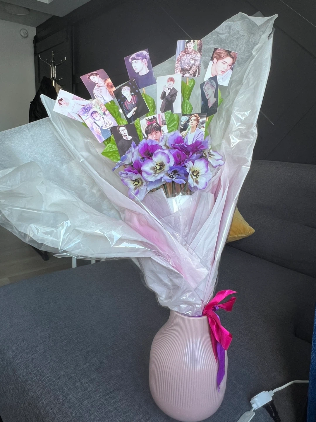 0A beautiful flower bouquet, decorated with K-Pop idol JIN from BTS photos with vase included.