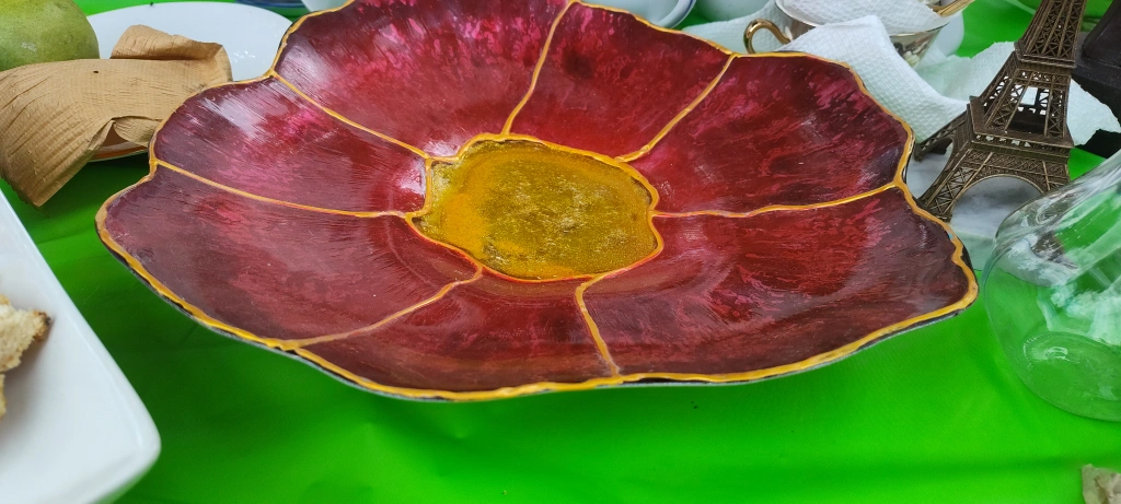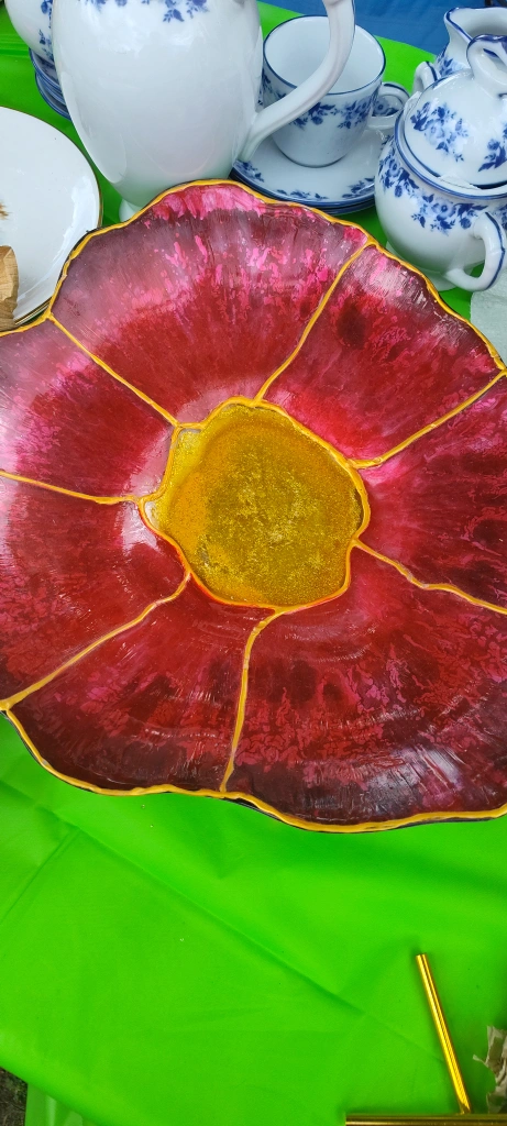 Selling a unique flower-shaped serving dish! It's perfect for adding a touch of whimsy to your table setting. The dish features a beautiful red and yellow colour scheme, resembling a vibrant flower in bloom. It's in great condition and ready to brighten up your next gathering