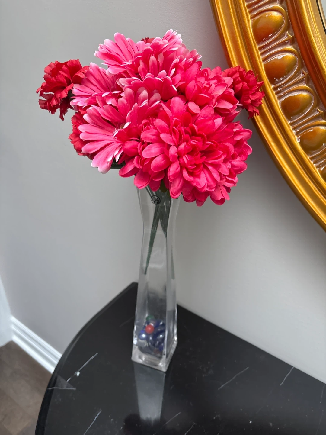 34Selling a clear glass flower vase with artificial red and pink flowers! The vase is in great condition and would look great in any room