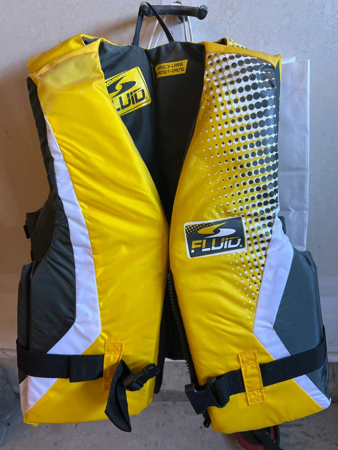 20Selling a Fluid life jacket in size X-Large. It's in great shape and ready for your next water adventure! The jacket is yellow and black with a cool pattern on the front