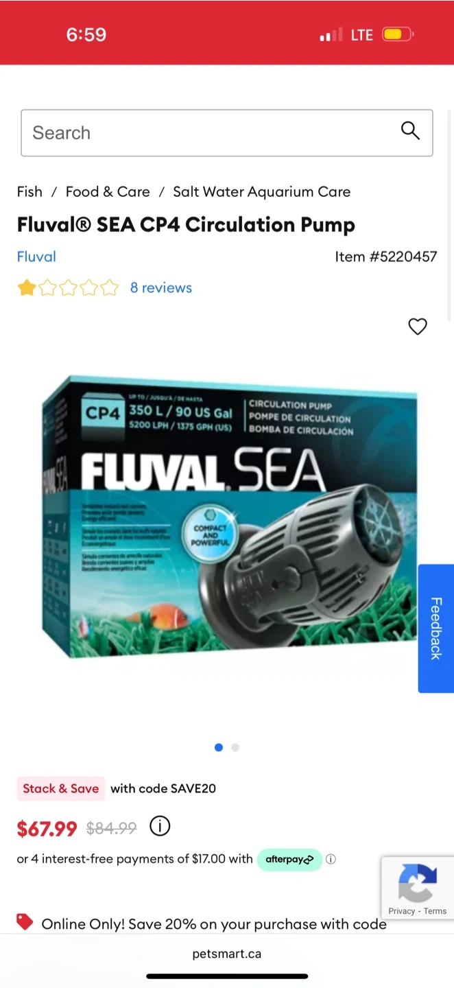 Selling a Fluval SEA CP4 Circulation Pump. It's designed to circulate water in salt water aquariums. It can handle up to 350 L / 90 US Gal, with a flow rate of 5200 LPH / 1375 GPH (US). Compact and powerful!