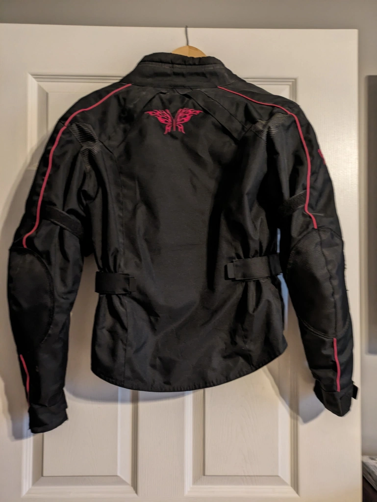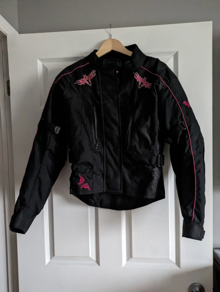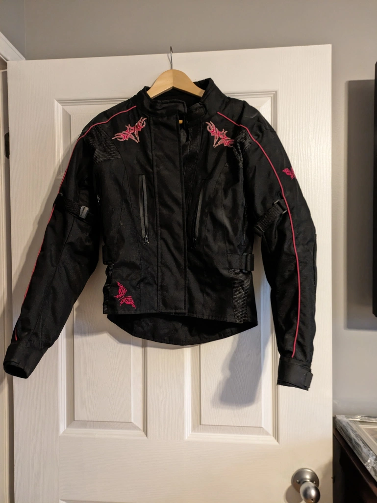 10Selling a Fly Racing motorcycle jacket in black with pink accents. It's in great condition and ready for your next ride! The jacket features a stylish design and is perfect for staying protected on the road. cash only