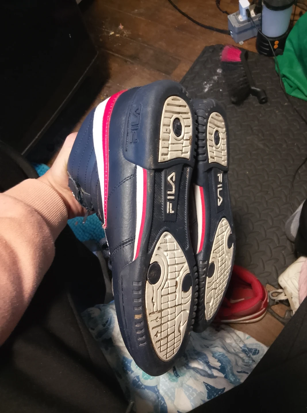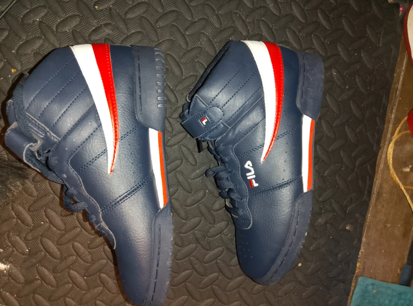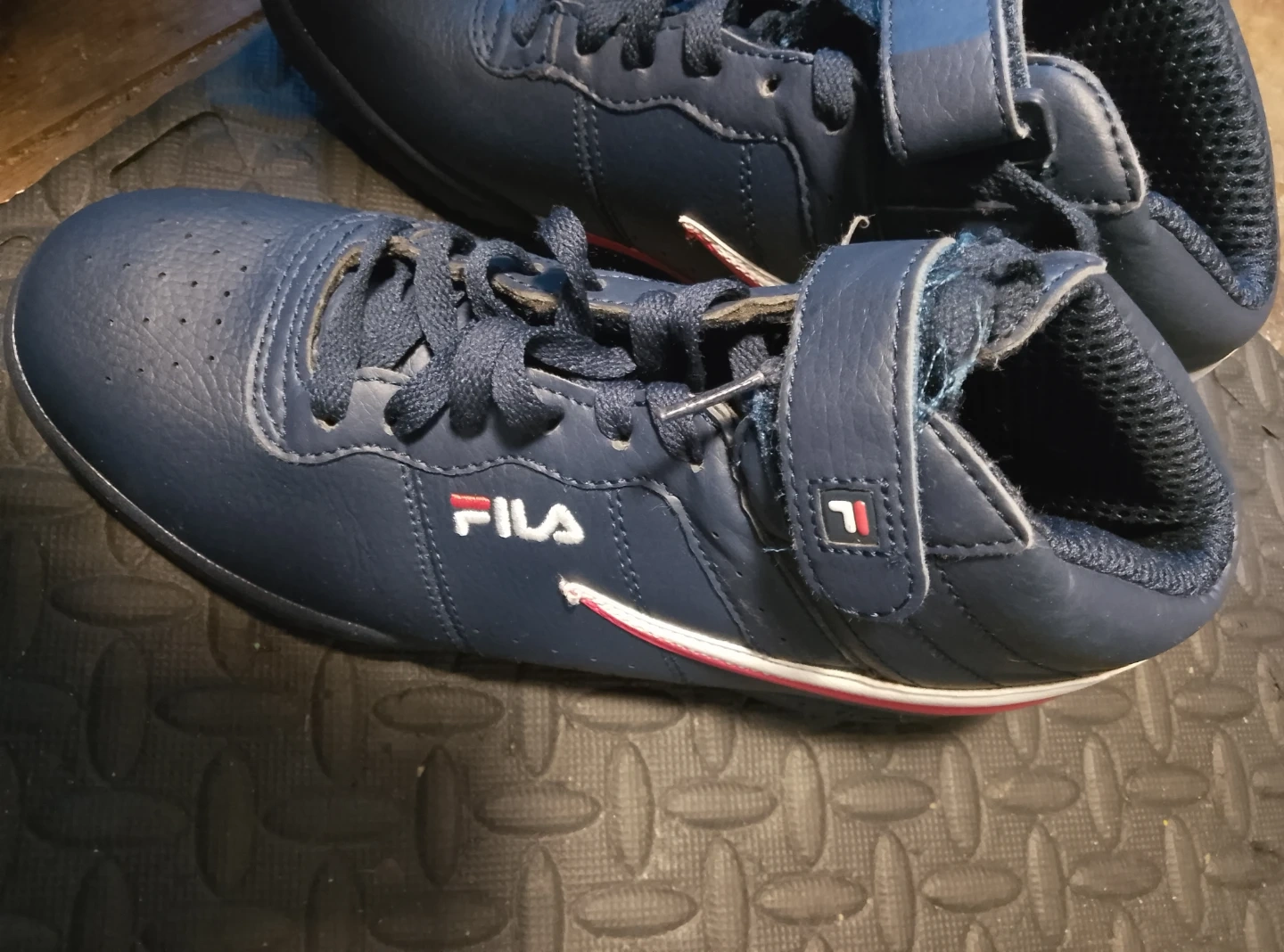 These Fila mid-top sneakers are a deep navy blue with red and white accents. They feature lace-up closure with an added velcro strap for extra support. Perfect for casual wear or light athletic activities.