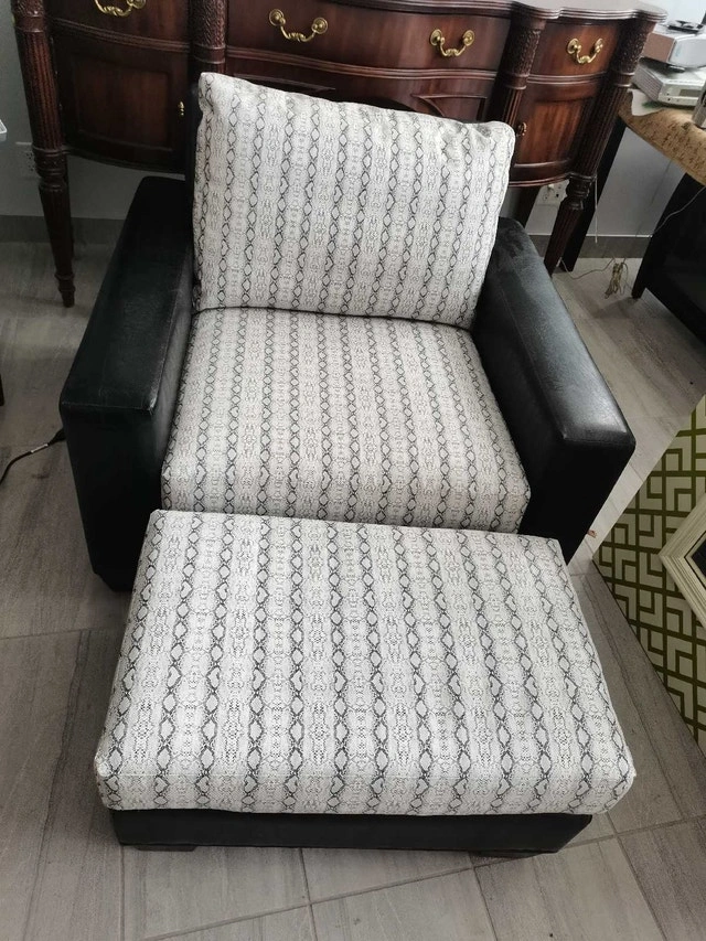 This Gresham House chair with matching ottoman is ideal for adding a touch of style and comfort to any living space, featuring a sleek black leatherette frame and contemporary patterned cushions, providing both aesthetic appeal and relaxation. This set has signs of wear.