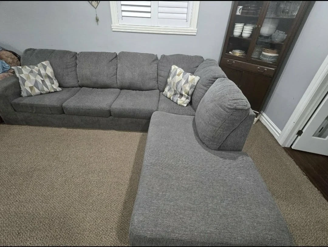 Spacious grey sectional sofa. Upholstered in a durable fabric. Includes two decorative throw pillows. I took very good care of this is bought it for 1,500 I have proof. Selling because I am going to my home country hoping I could get someone to buy it!.