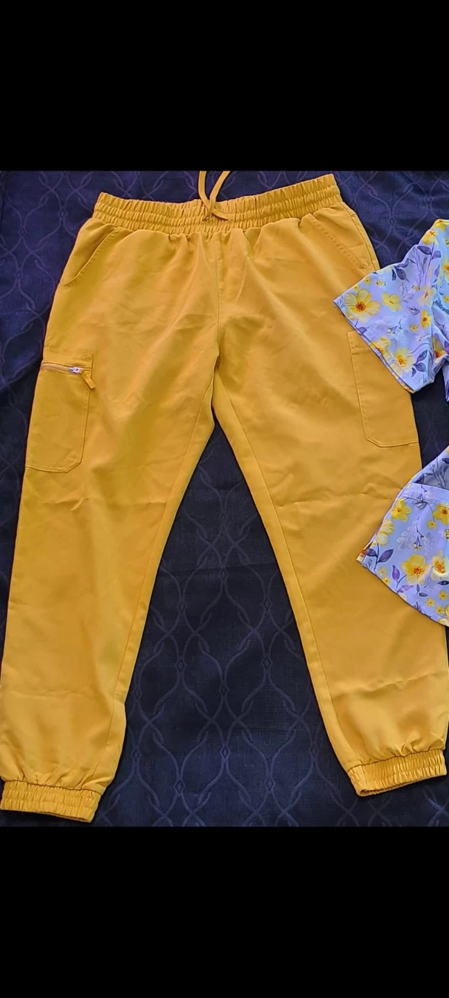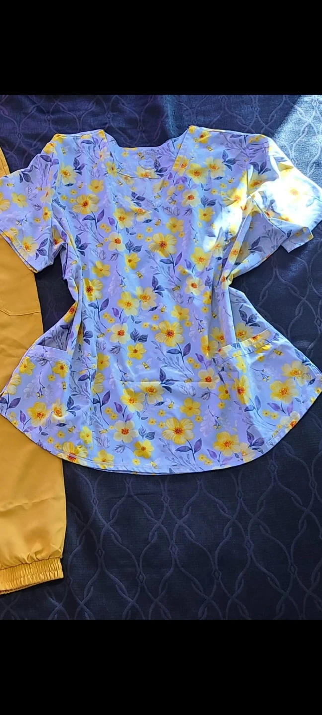 This is a scrub set featuring a light blue top with a yellow floral print and matching yellow jogger pants. The top has a V-neck and short sleeves. The pants have a drawstring waist and elastic cuffs. They're comfortable for everyday wear.