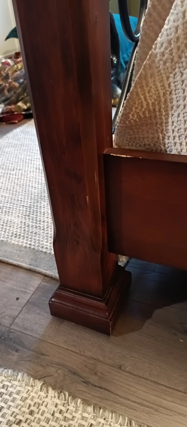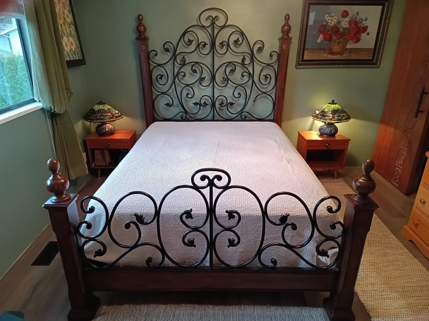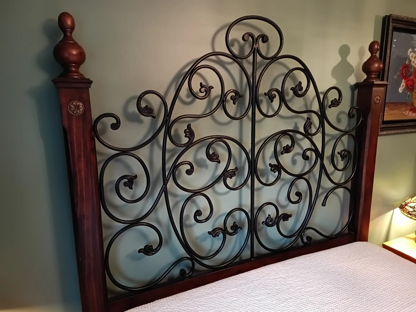 This is a beautiful iron and wood bed frame. It features solid wood construction with decorative metal scrolled inlays.The frame rails and posters are dark wood with accents.