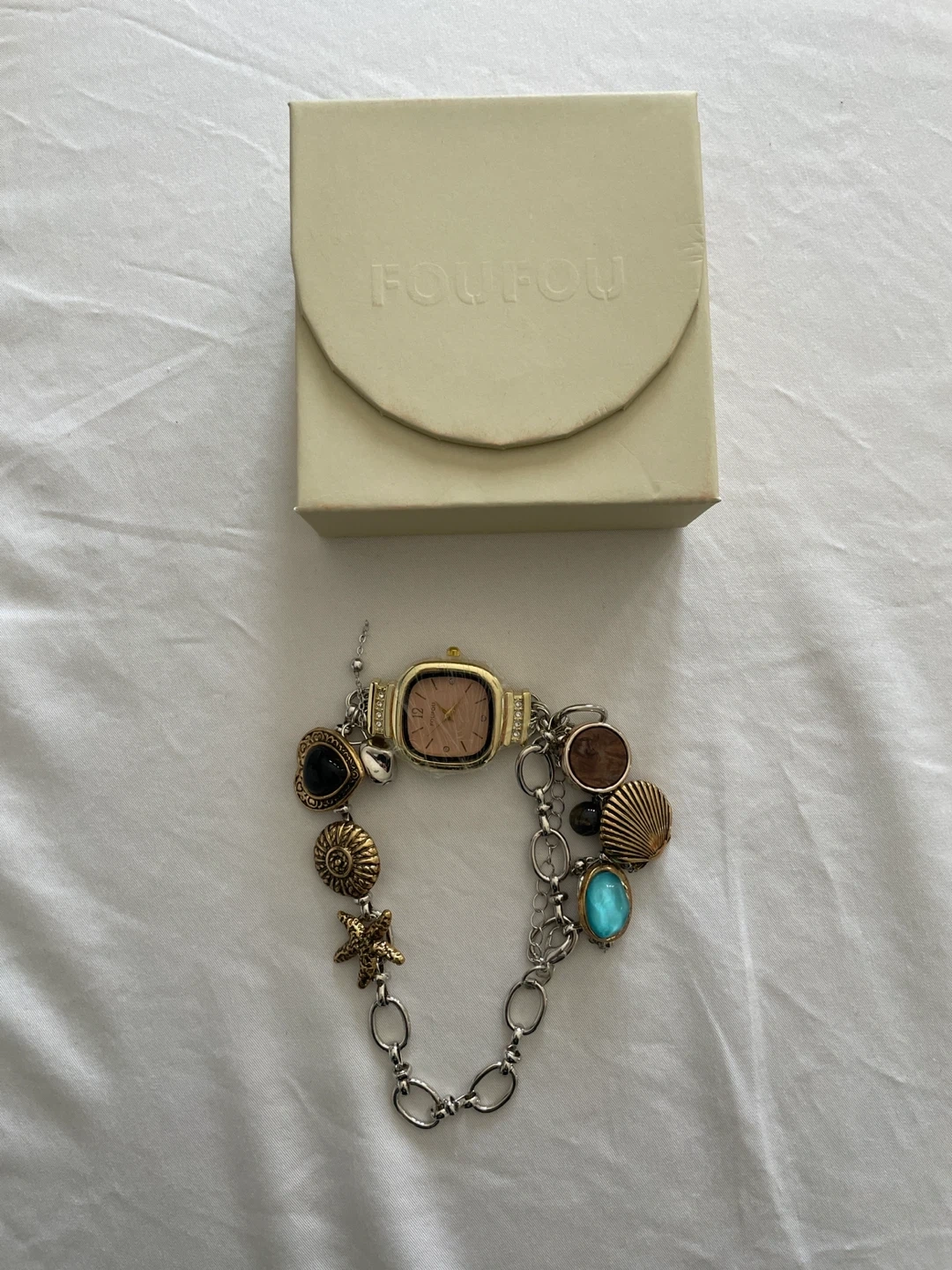 This FOUFOU charm bracelet watch features a rose gold-toned square face with a pink dial and quartz movement. It's adorned with various charms including a black heart, seashell, starfish, and a turquoise-coloured stone. The watch comes with its original box.