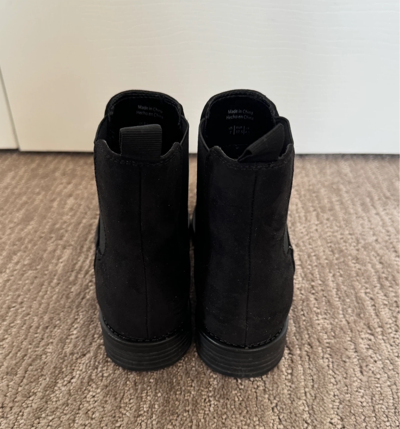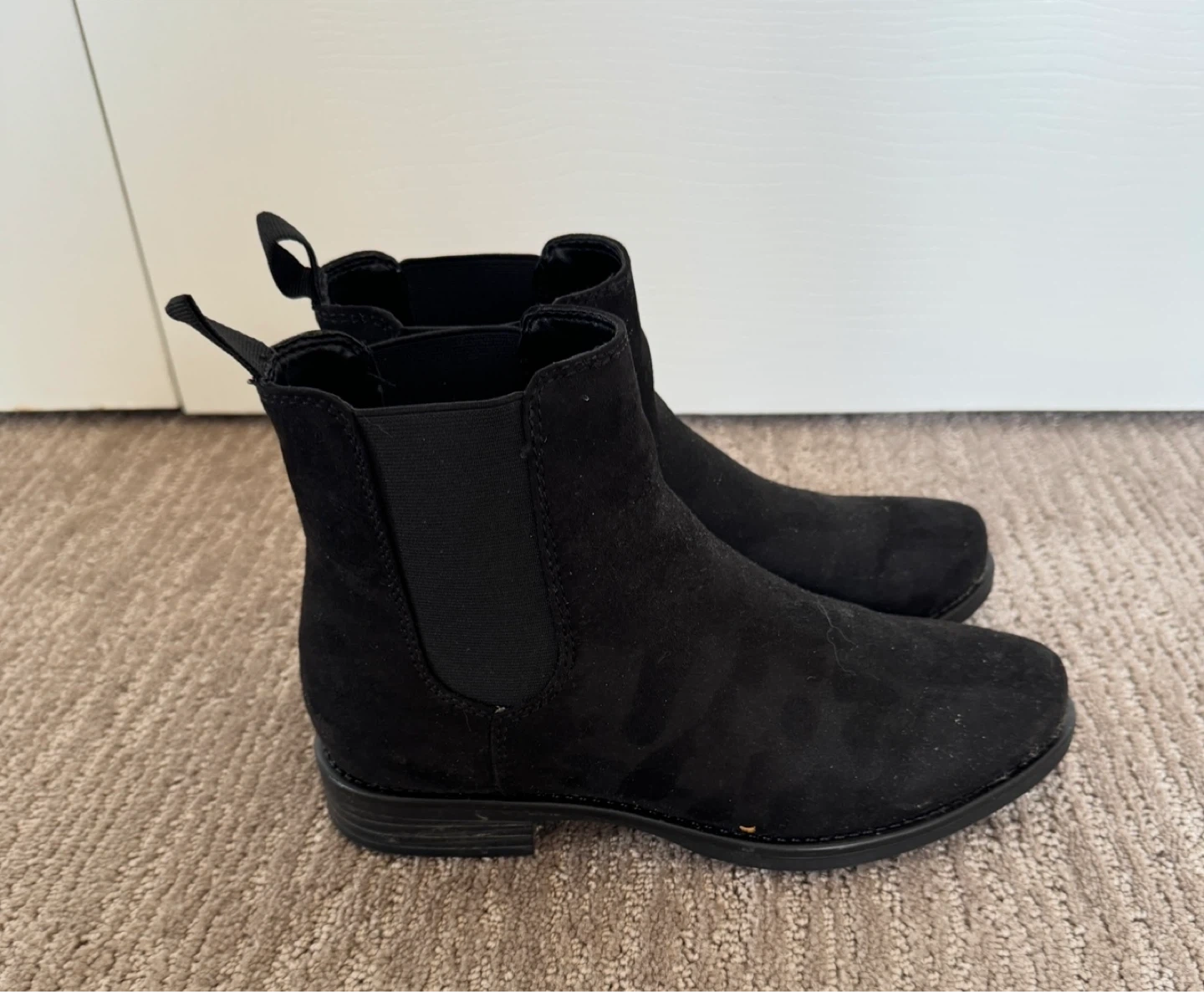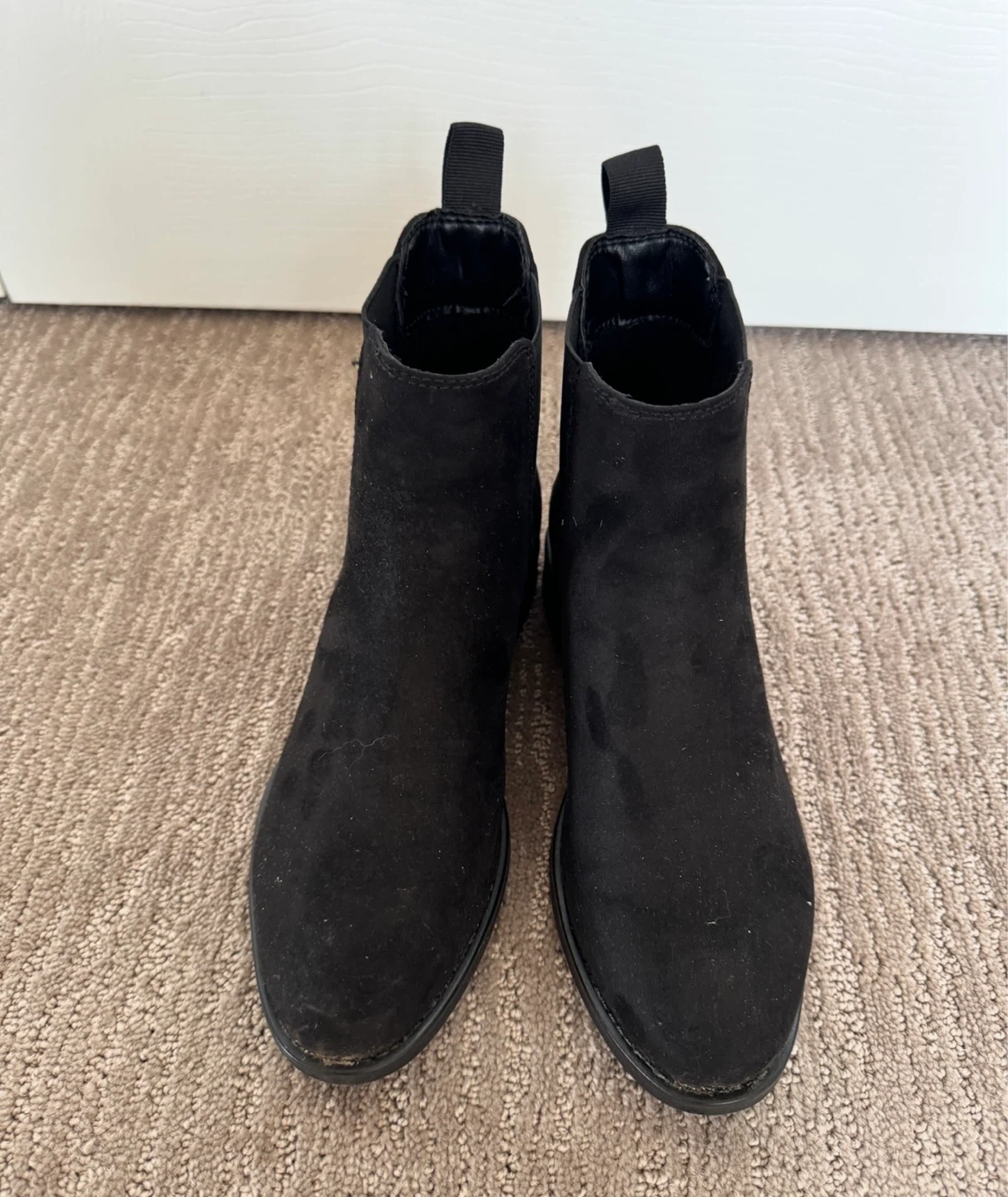 The black Chelsea boots are made with a faux-suede material. They have elastic side panels and pull tabs at the back to put on and take off easily.