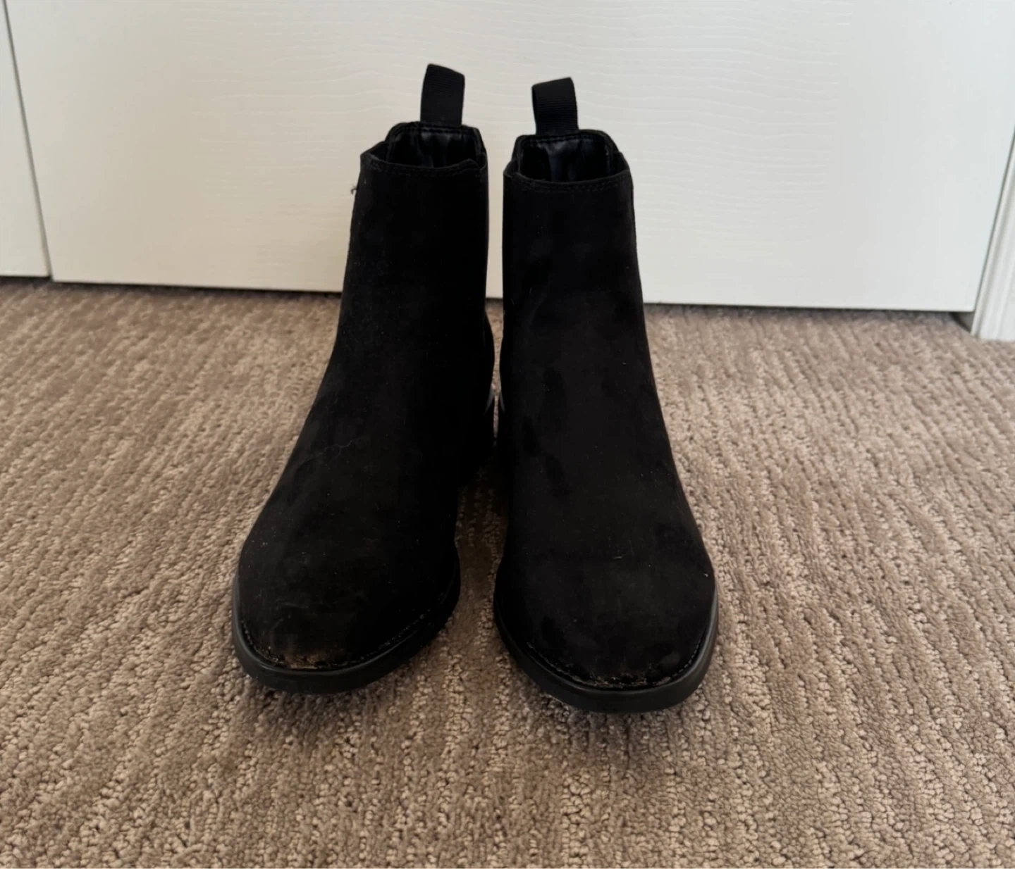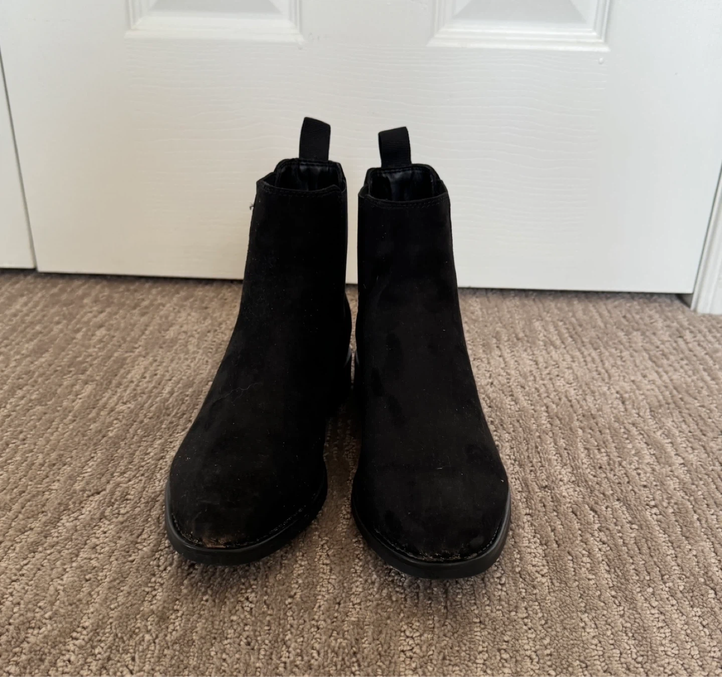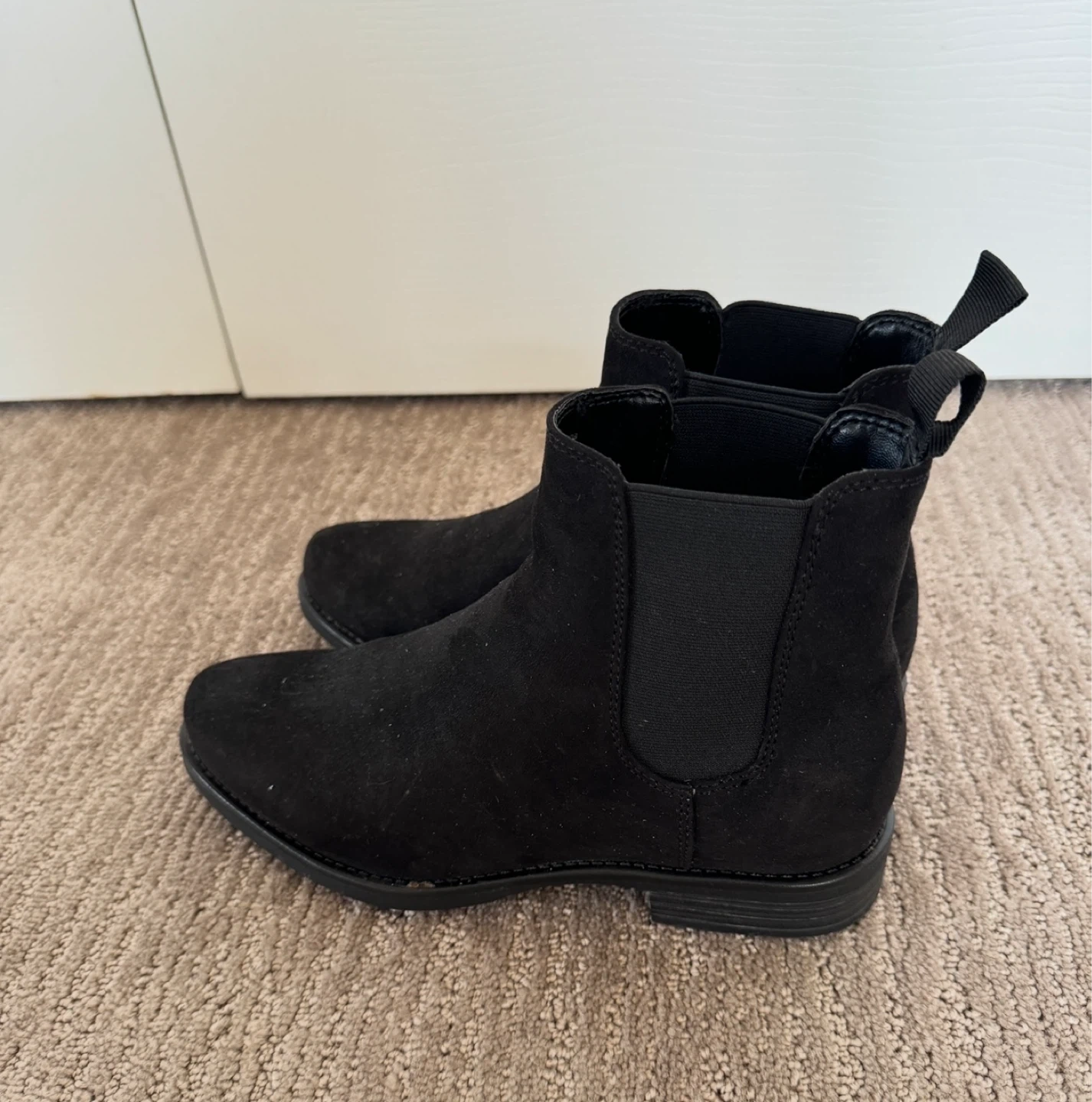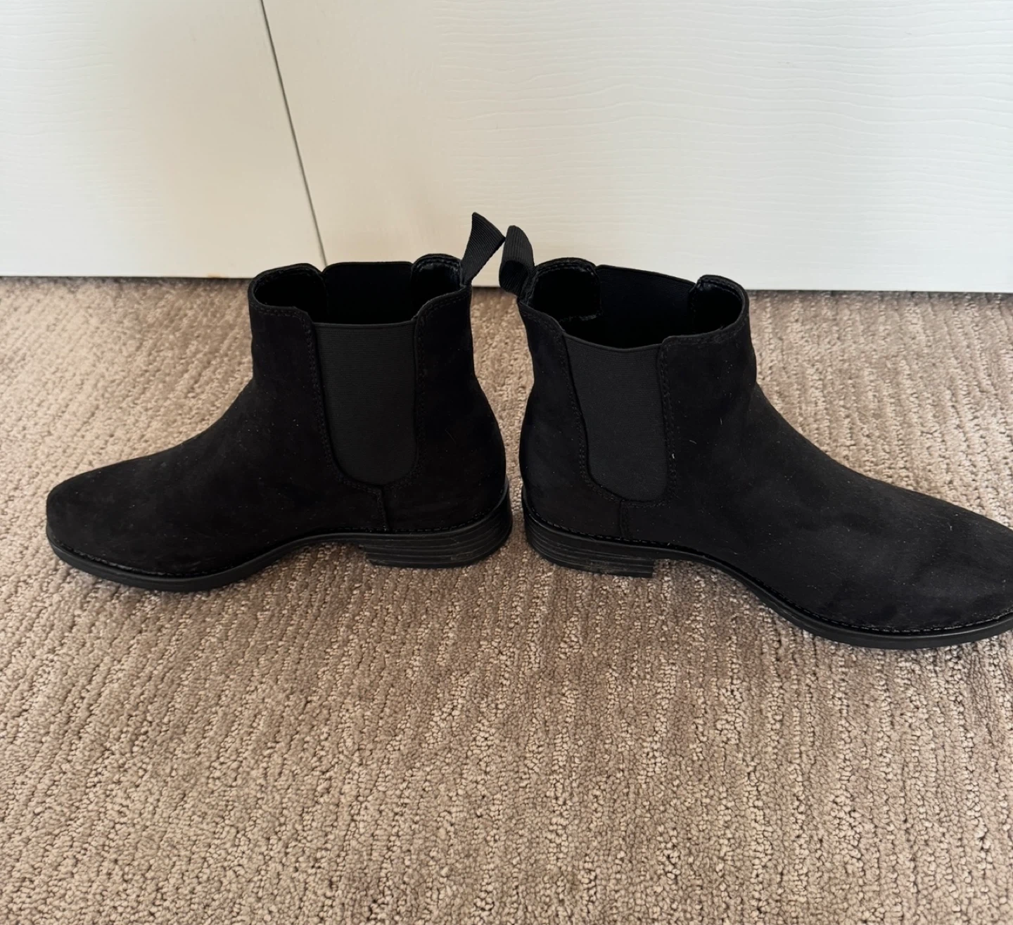 The black Chelsea boots are made with a faux-suede material. They have elastic side panels and pull tabs at the back to put on and take off easily.