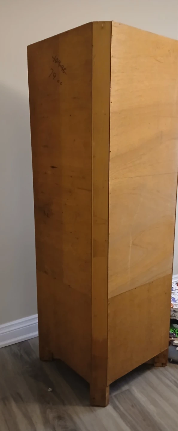 Here's a lovely wooden corner cabinet! It features glass doors on the top section and a drawer at the bottom. It's perfect for adding some extra storage and a touch of charm to any room.
