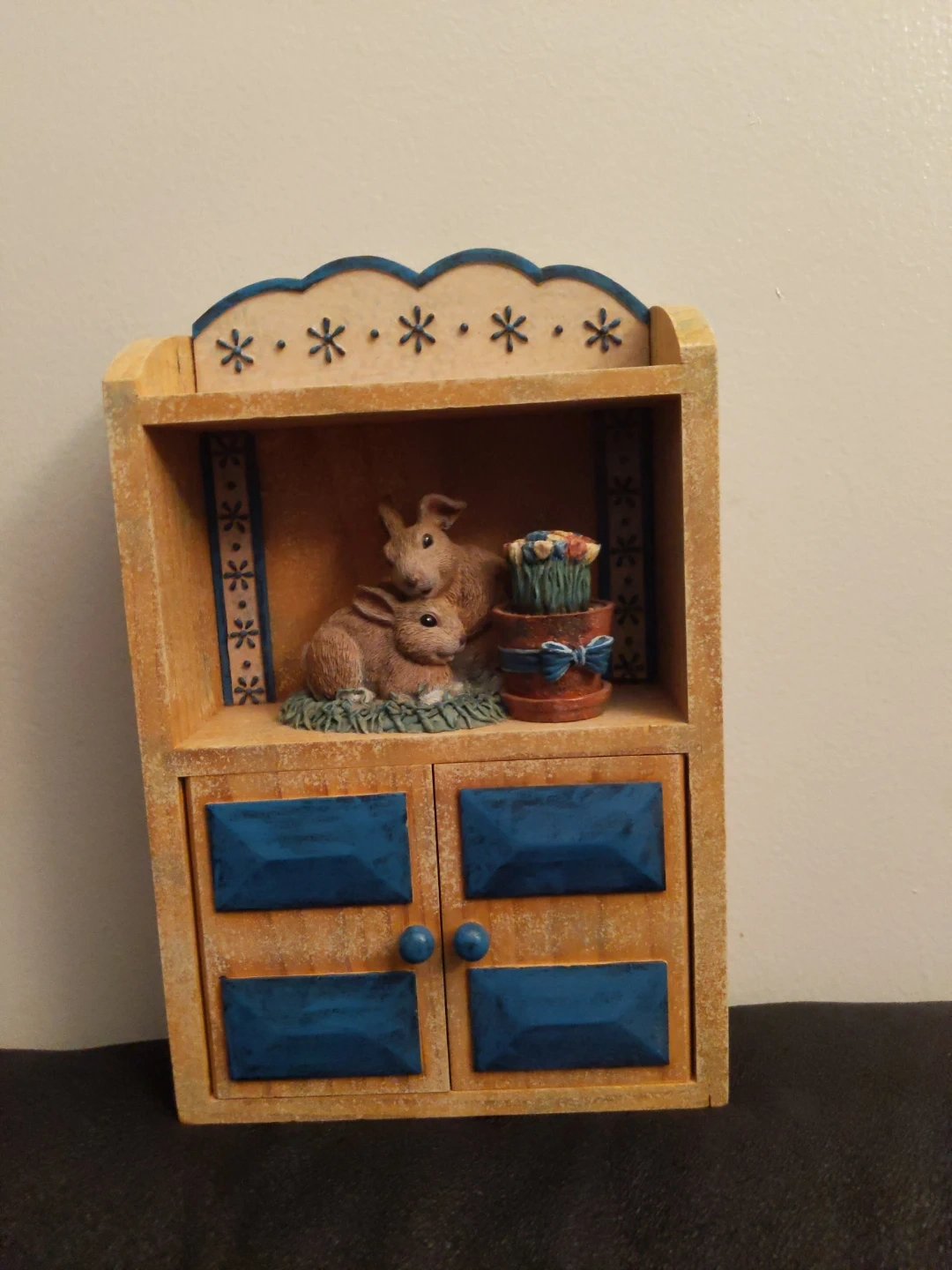 This is a quaint wooden cabinet with a distressed finish, featuring two adorable bunnies and a pot of flowers. It has blue decorative cabinet panels. It's a charming piece to hold small items.