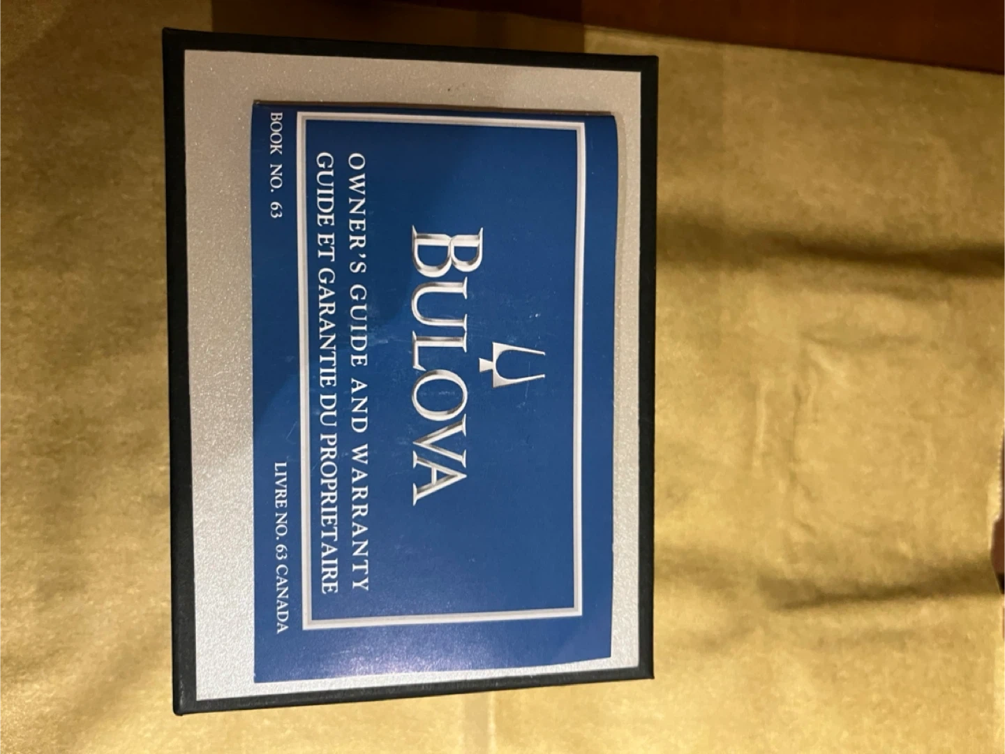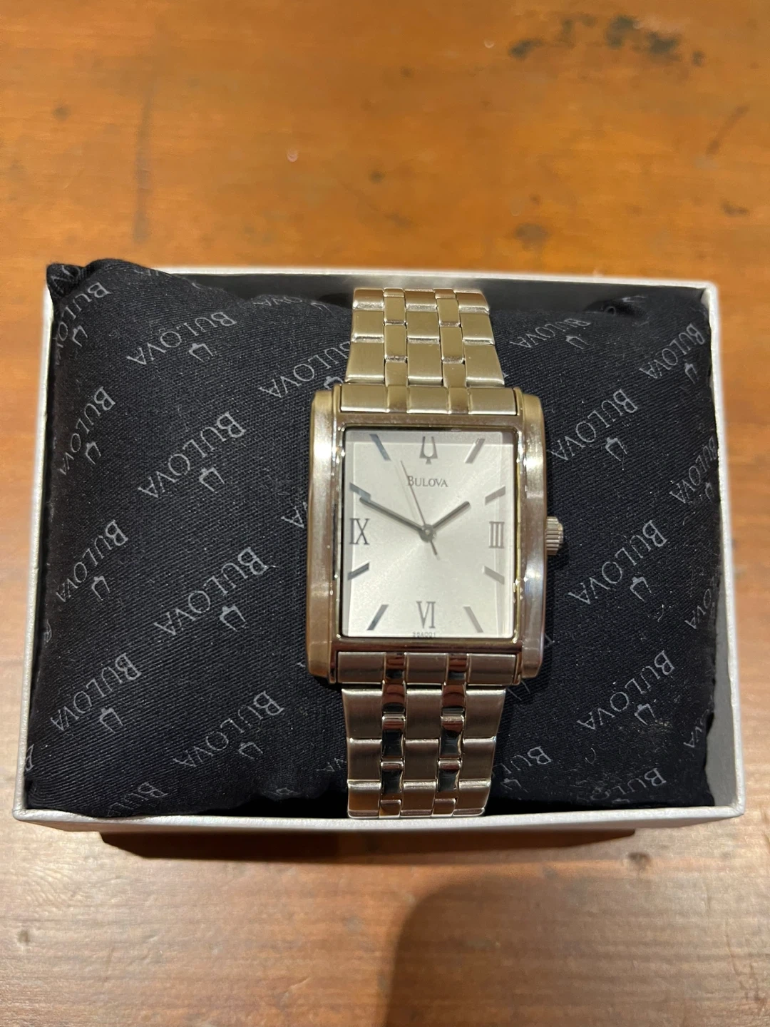 This is a Bulova watch with a rectangle face and a metal band. It includes the original box and owner's guide. The watch has Roman numerals on the face.