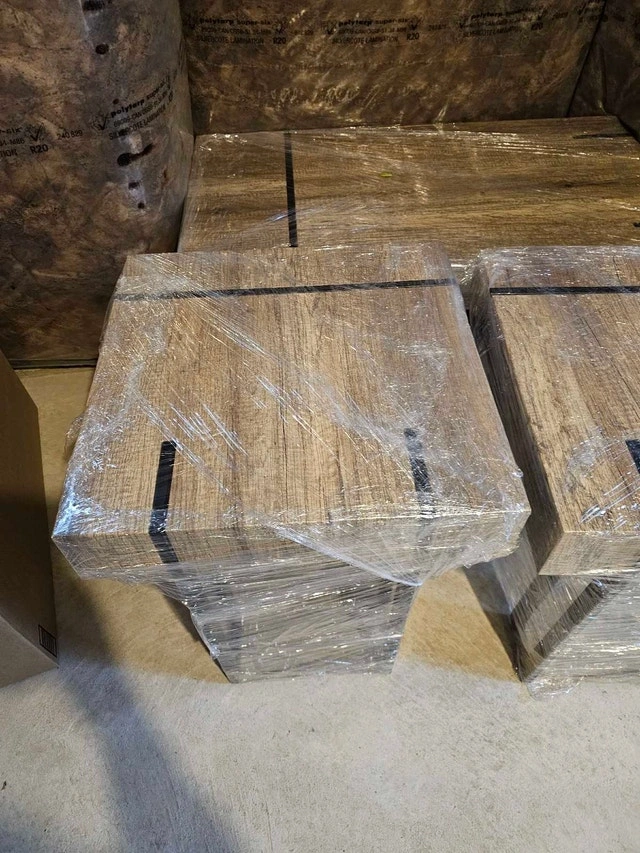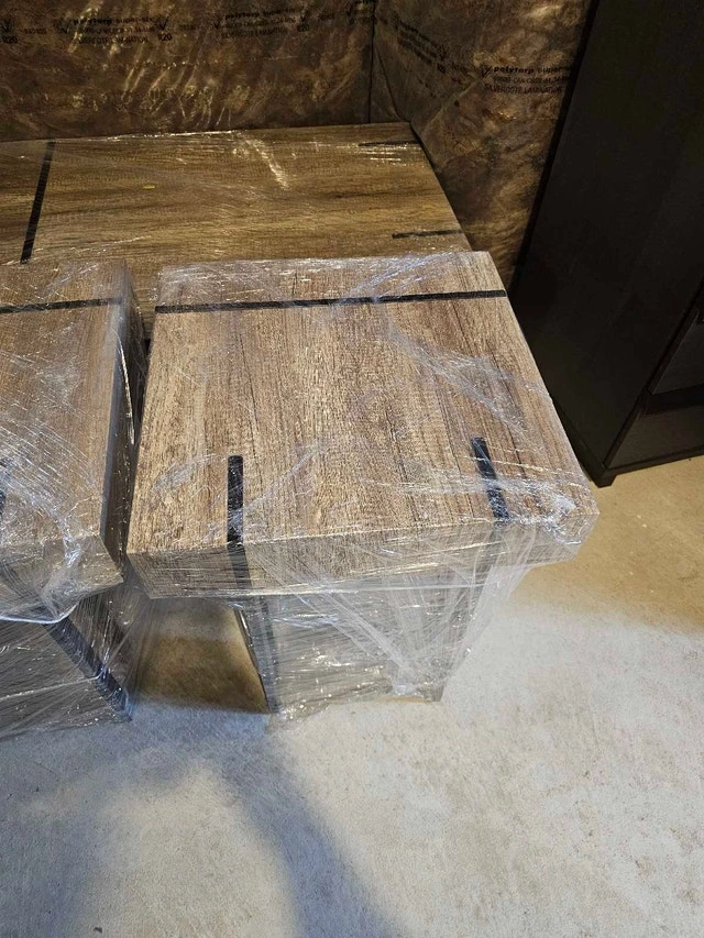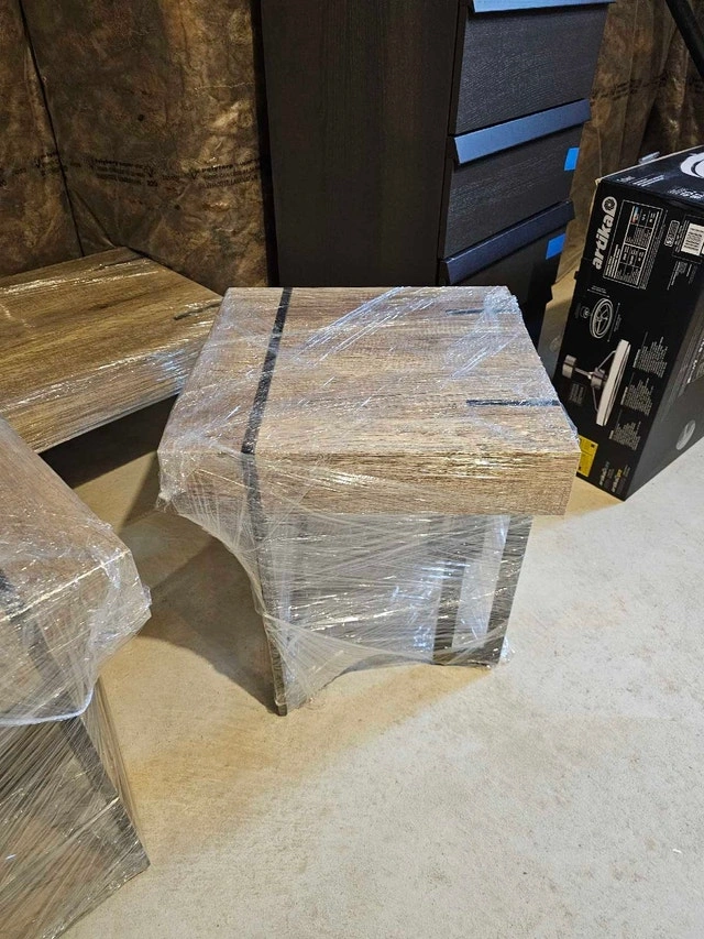 Selling a new, high-quality coffee table and two matching side tables, perfect for adding a a touch of elegance to any living room. These tables have never been used and are still wrapped in their original packaging. Coffee Table Dimensions: 43" (L) x 23" (W) x 16" (H). Side Table Dimensions: 19 3/4" (L) x 19 3/4" (W) x 22.5" (H). Material: Solid wood with a beautiful veneer finish. Colour: Rich brown. The stands are metal with metal accents on the topside of the tables. Style: Modern, minimalist design. These tables are in pristine condition, ready to be the centrepiece of your living space or a stylish addition to your bedroom. It's a fantastic opportunity to own a high-end set at a great value!