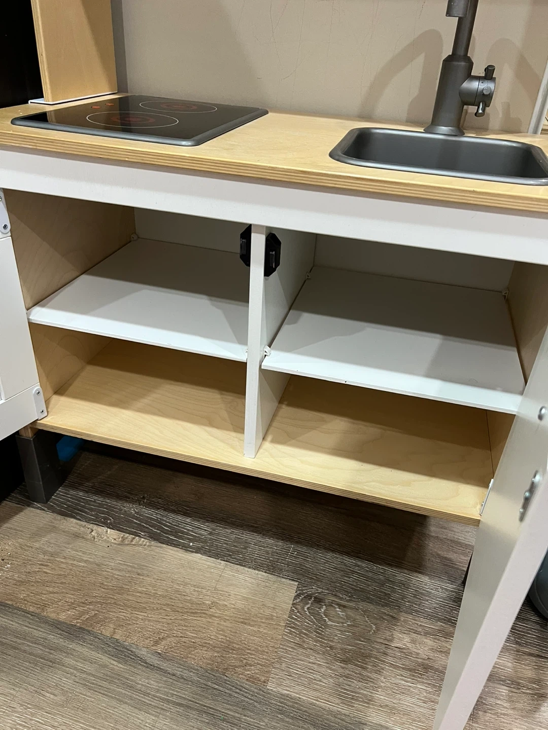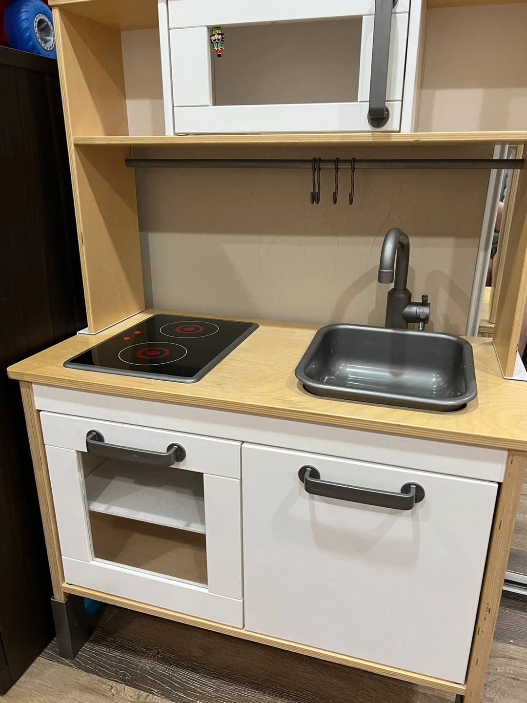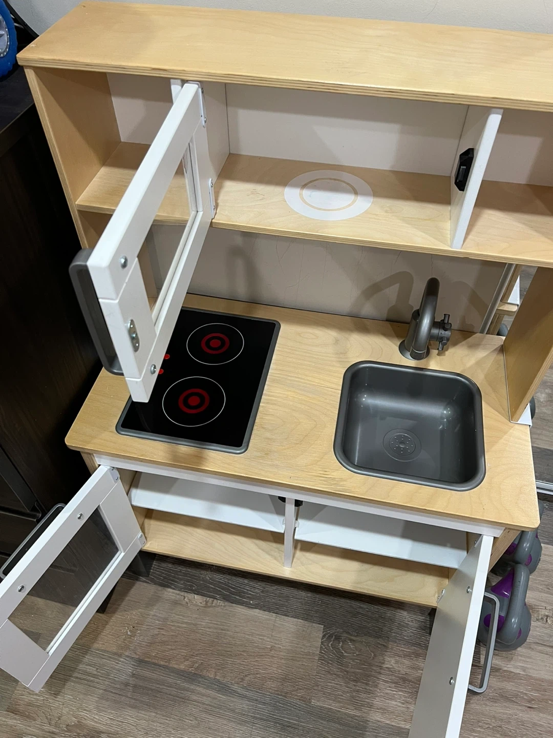 This play kitchen features a sink, stovetop, oven, and microwave. It's made of durable wood and has plenty of storage space. Perfect for imaginative play!