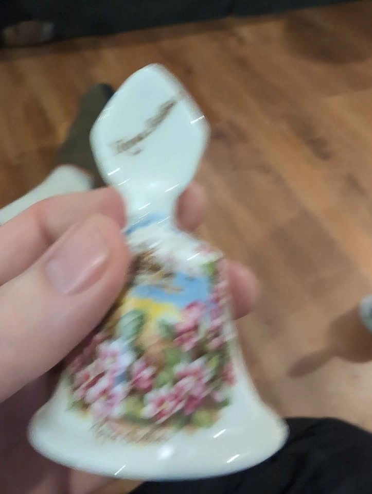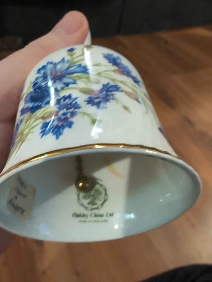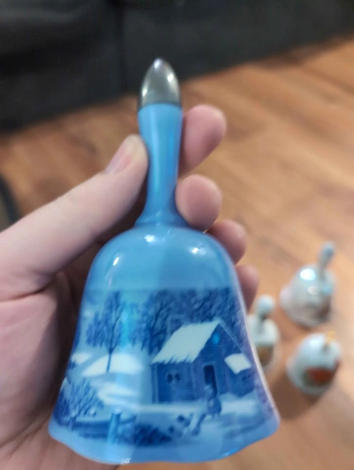 Set of 7 vintage porcelain hand bells with floral, souvenir, winter scene, and anniversary designs. Includes pieces marked Galway Irish Crystal and Saji Japan Fine China. Nice decorative collection for display or for bell collectors. $35 for the set. Pickup: Surrey Central, Guildford Mall, or New Westminster Quay.