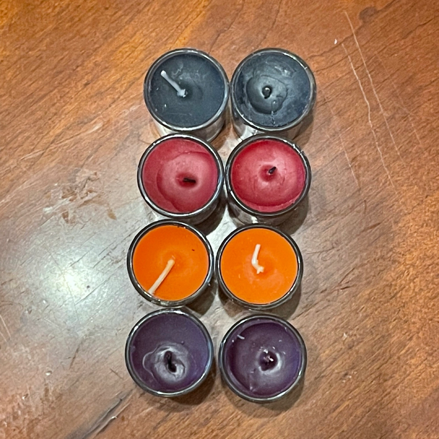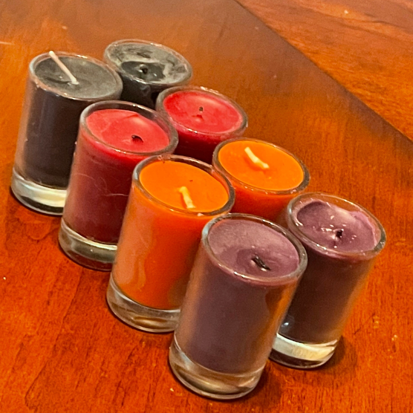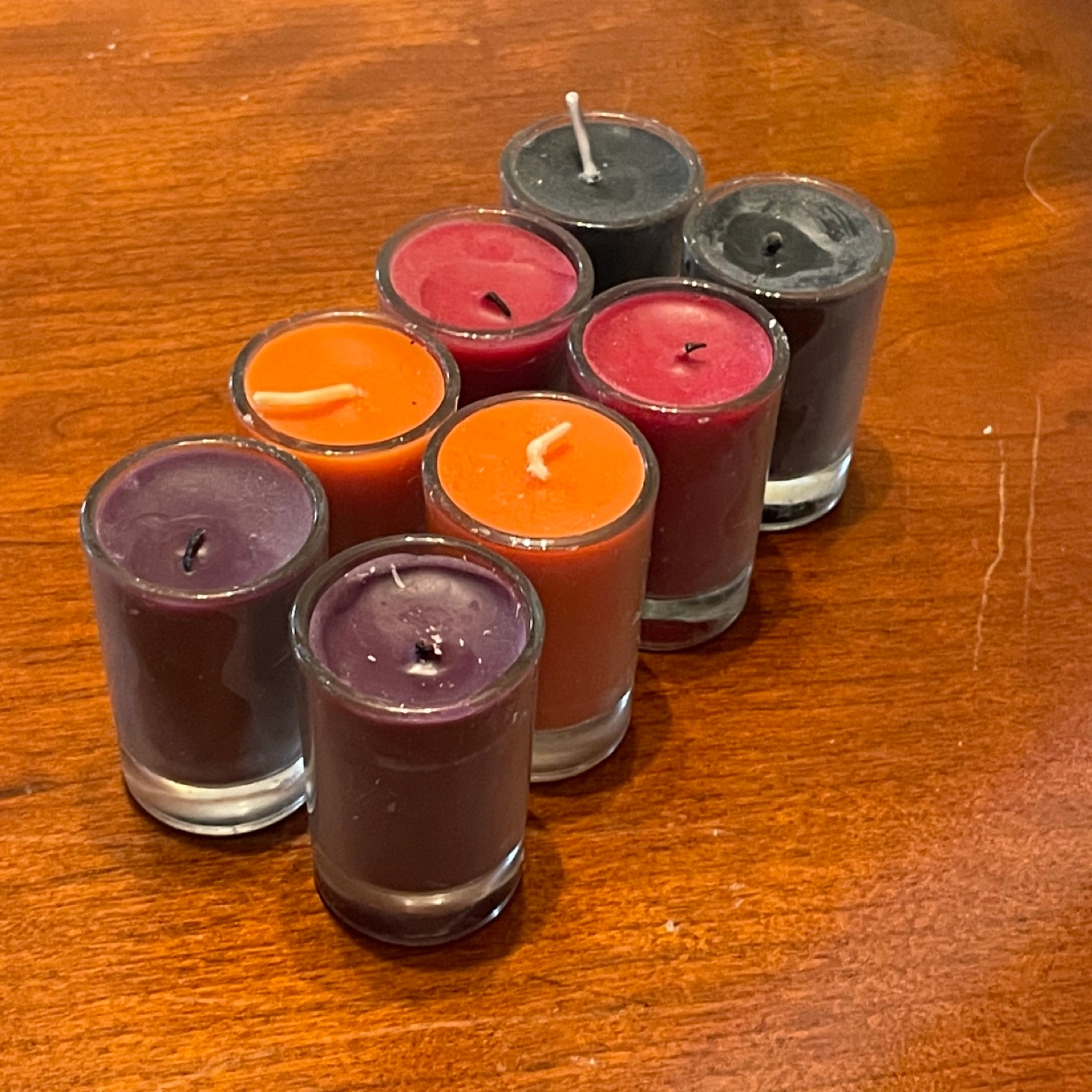 There are purple, orange, red, and black candles. They come in a glass holder. Five of the wicks have been burnt, but have not melted the wax. about 2 inches tall. Alright condition