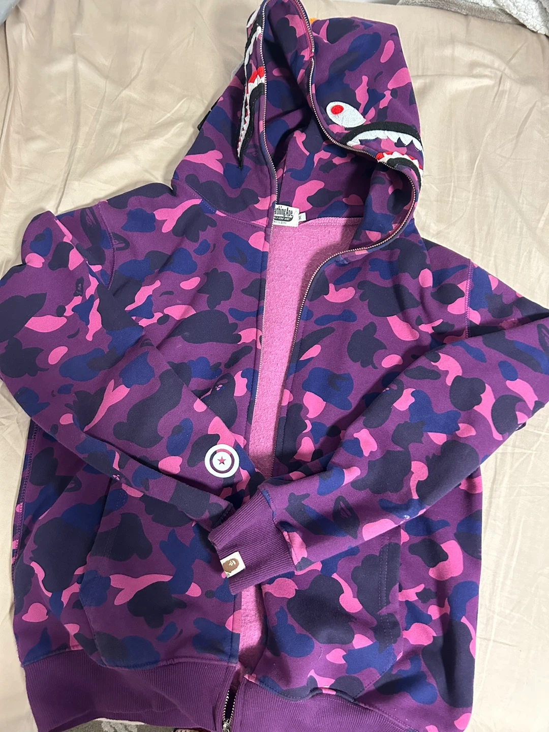 Selling a Bathing Ape (BAPE) full zip hoodie in a cool purple camo pattern! It features the iconic shark design on the hood. Great for adding some streetwear style to your wardrobe