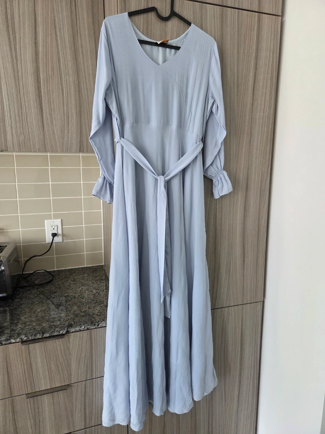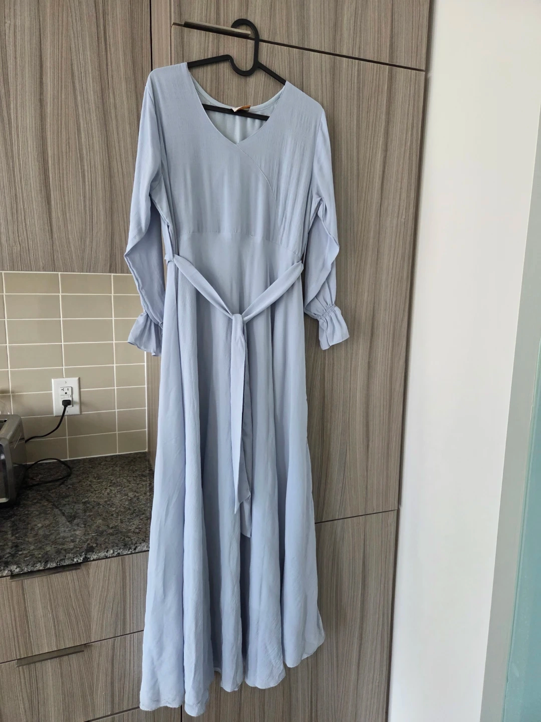 This is a light blue maxi dress with a V-neck and long sleeves. It features a self-tie belt at the waist and ruffled cuffs. Made from chiffon, it's perfect for various occasions. Its long, so would recommend to people that are 5'5 and over.