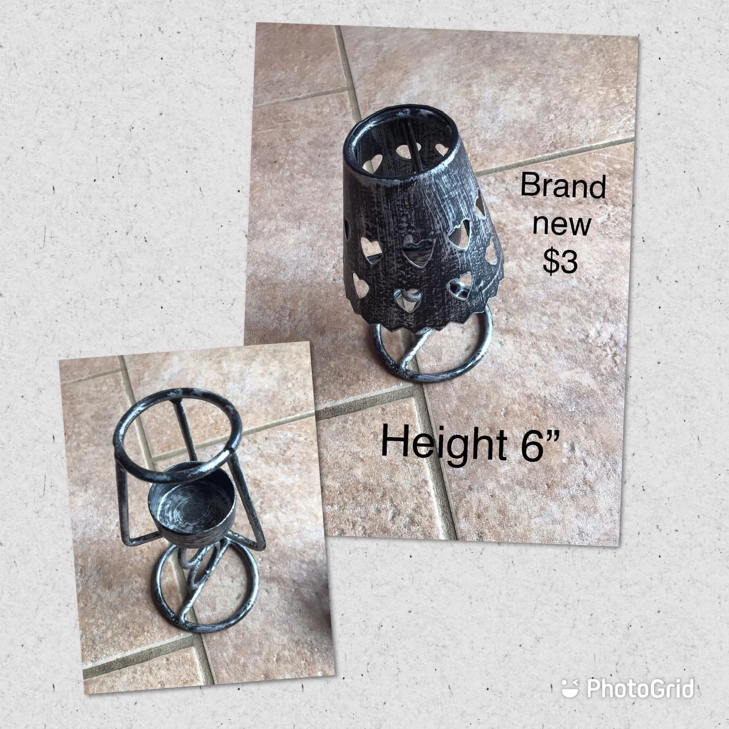 Brand new metal tealight candle holder with heart cutouts. Height is 6". This holder's design would be nice for a cozy atmosphere!