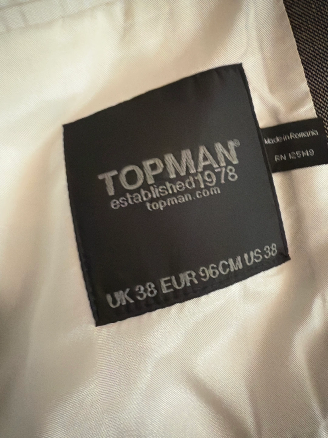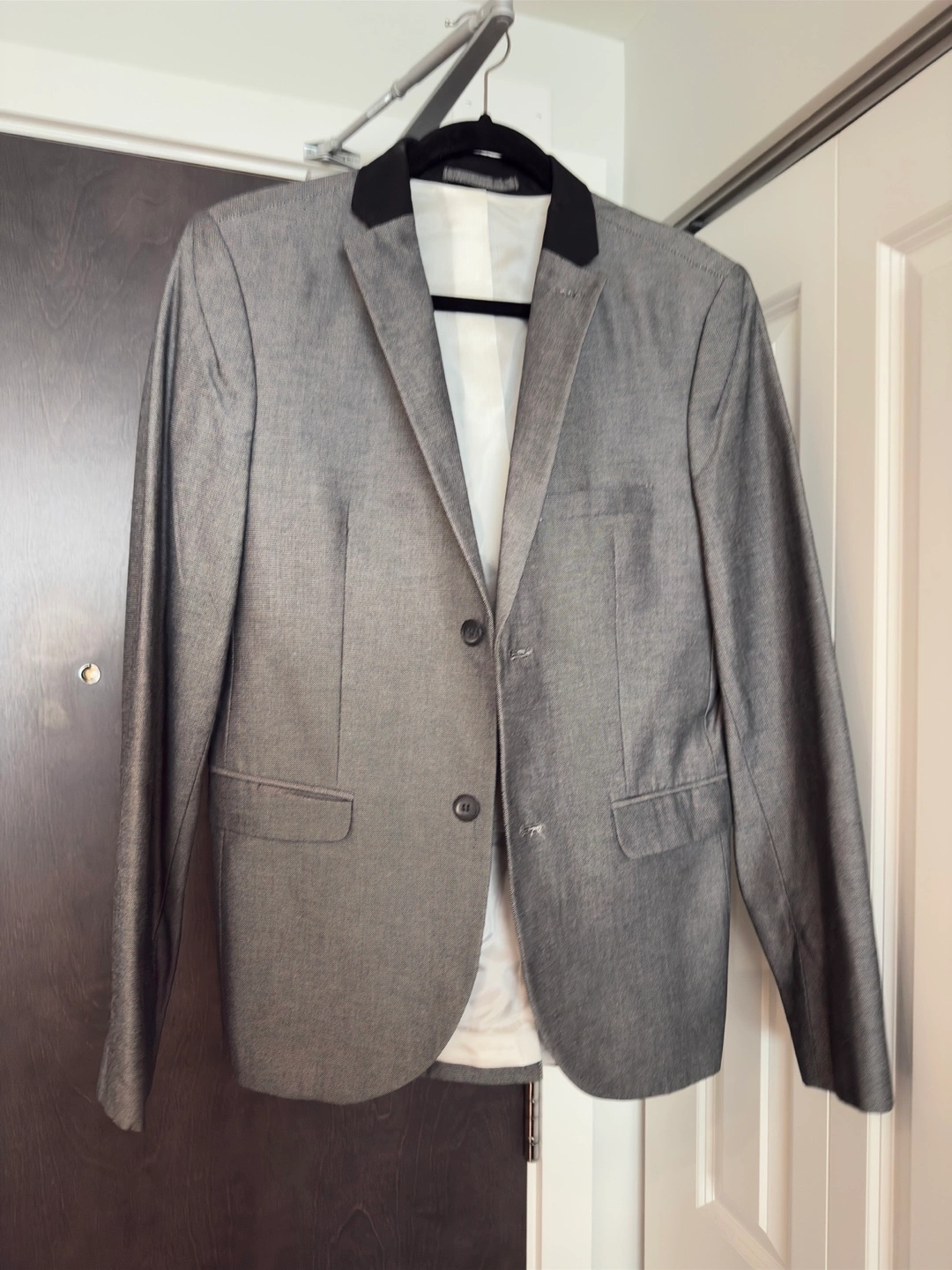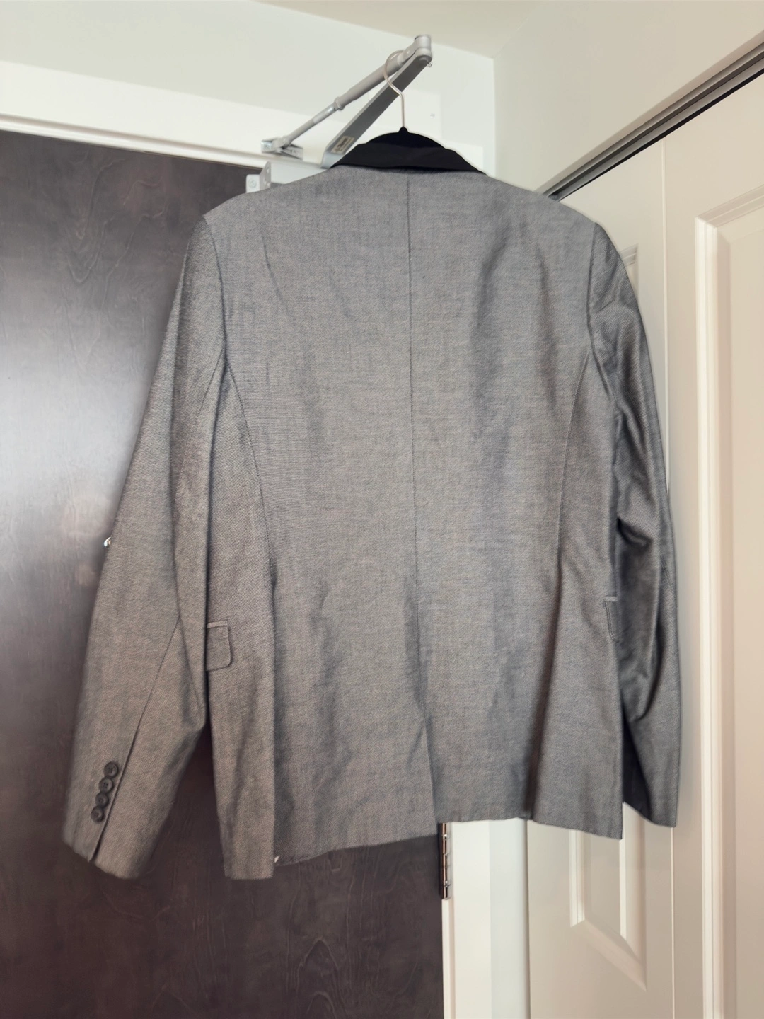 Men's grey blazer. Size UK 38, EUR 96cm, US 38. Black velvet collar. Two button closure. Long sleeves. Good condition.