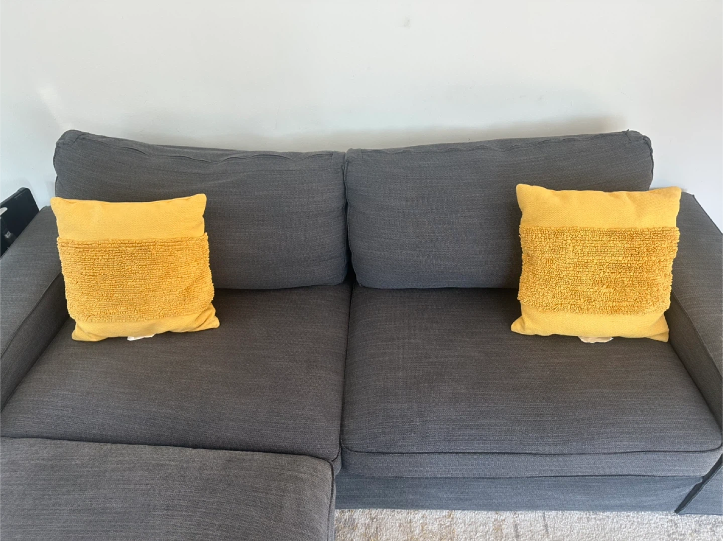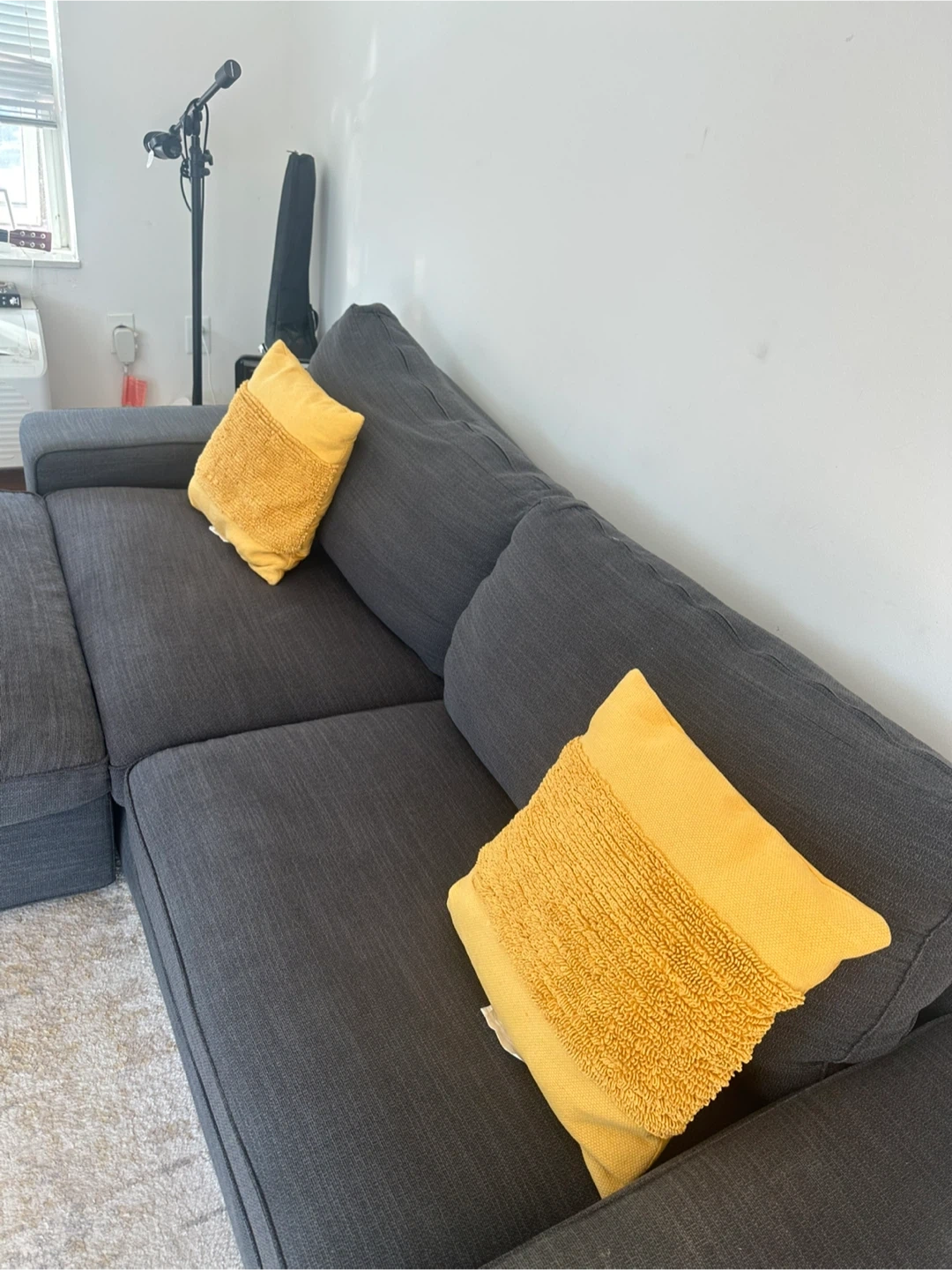 Dark Gray Ikea Sectional Sofa with Chaise and Yellow Pillows