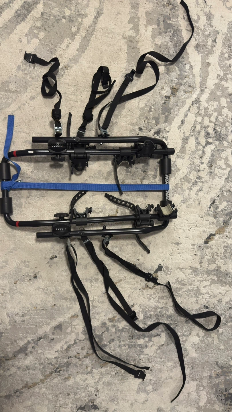 This is a Hollywood Racks trunk bike rack. It includes multiple straps for secure mounting. This rack is great for transporting your bikes on road trips or daily commutes!