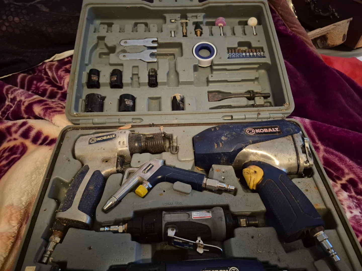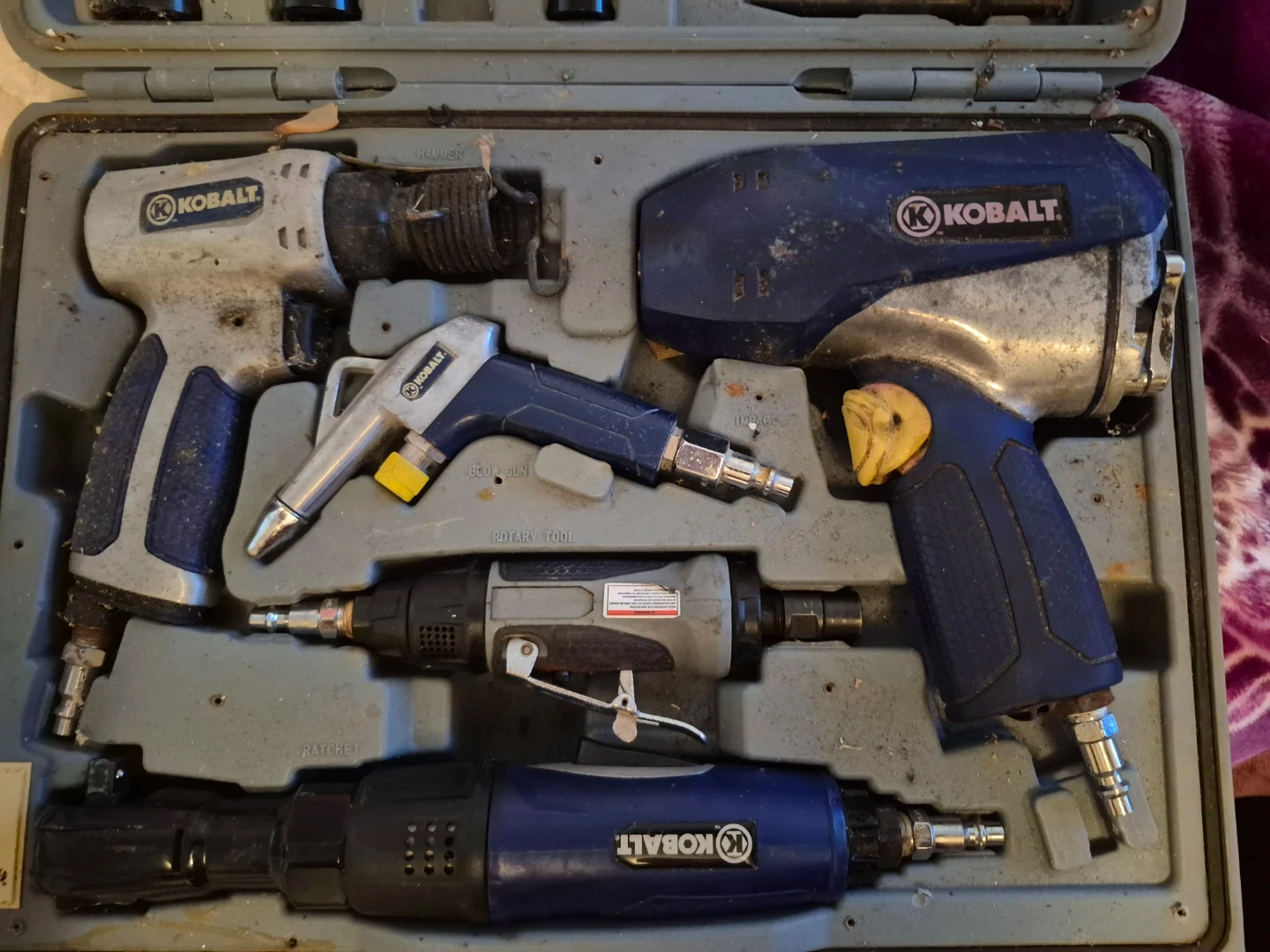 This Kobalt air tool kit includes an impact wrench, air ratchet, and a blow gun. It also comes with various attachments and accessories. Everything is stored in a durable carrying case.