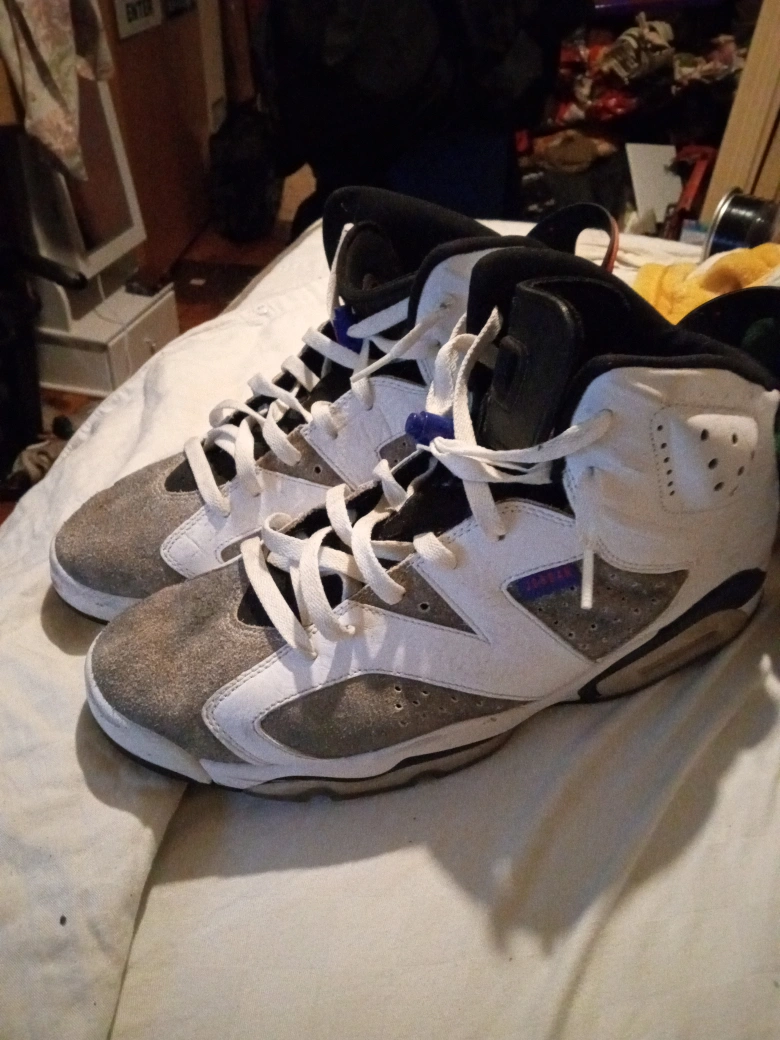 size 11 Air Jordan it's not the pump ups that you push with air and it says air Jordan White with gray little scuffed here and there but you could see it yourself they are in still good shape good condition listen don't care really about the price you could you could try to get it for more money I'm only asking 50