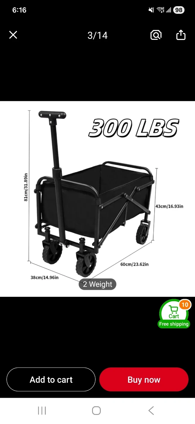 This black folding wagon supports up to 300 lbs! It's 81cm tall with a handle and measures 60cm long by 38cm wide. The wagon is 43cm high. It's great for hauling gear to the beach or for camping trips!