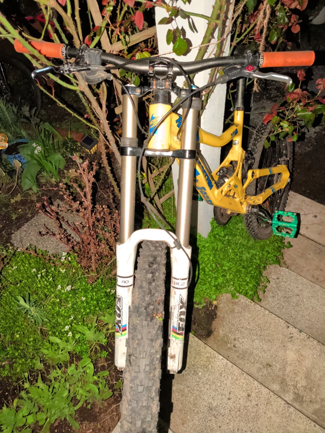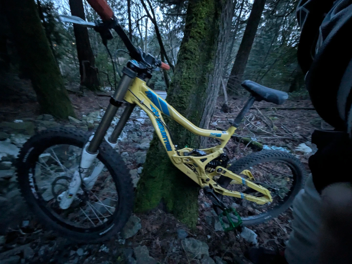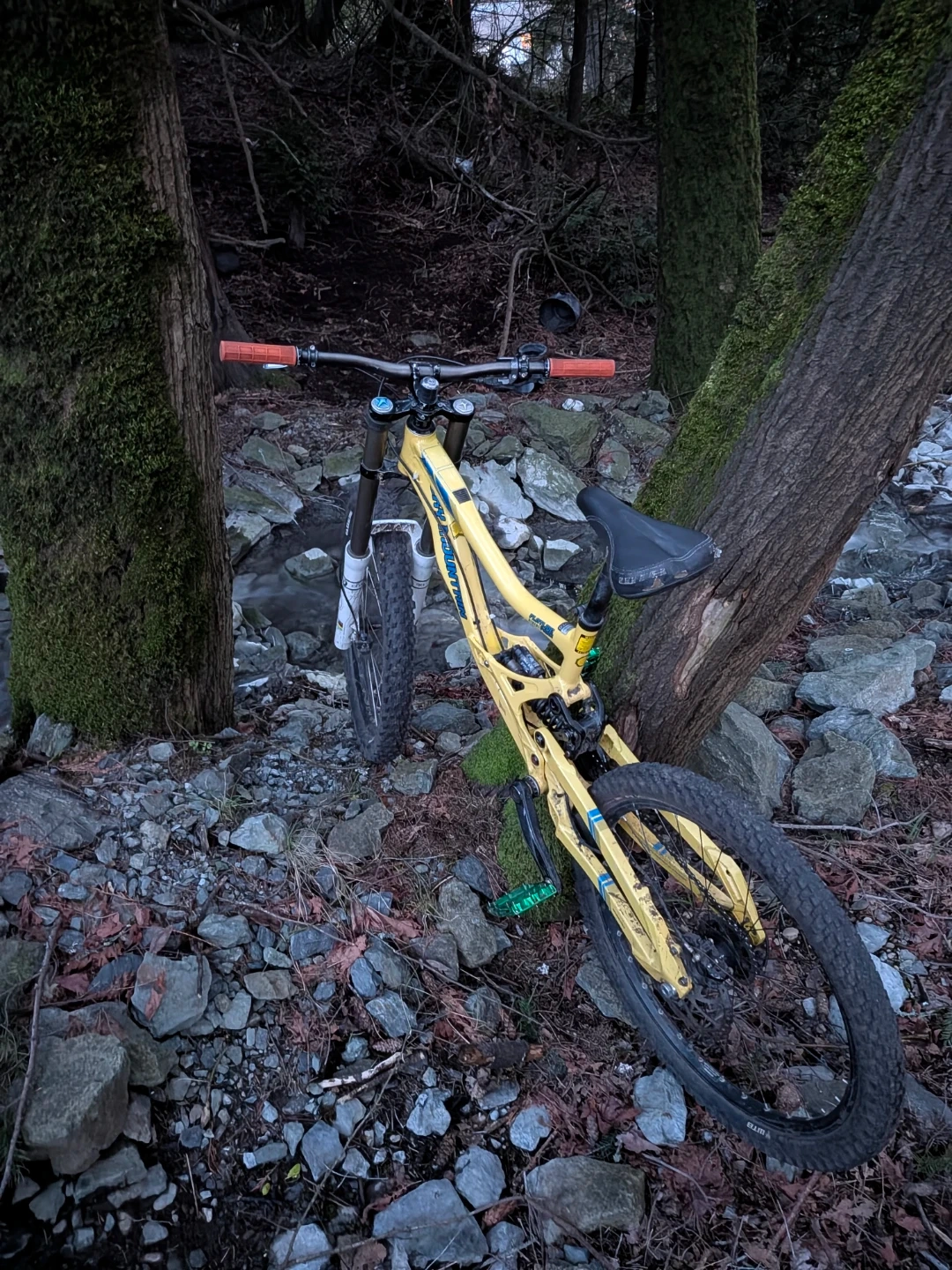 Yellow Rocky Mountain Flatline park downhill bike. Features a DHX 3.0 rear shock and Fox front suspension. Green pedals included. This bike's built for shredding the trails!