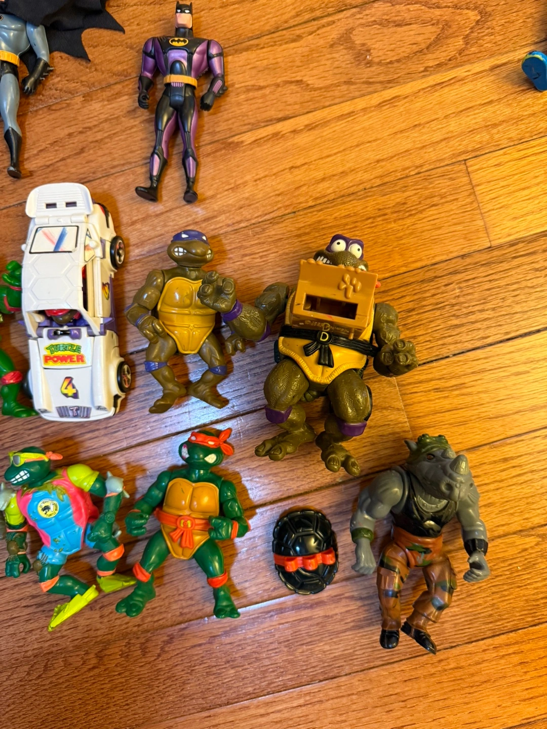 Collection of vintage action figures. Includes Teenage Mutant Ninja Turtles figures, vehicles, and accessories. Also features Batman figures. Great for collectors or nostalgic fans.