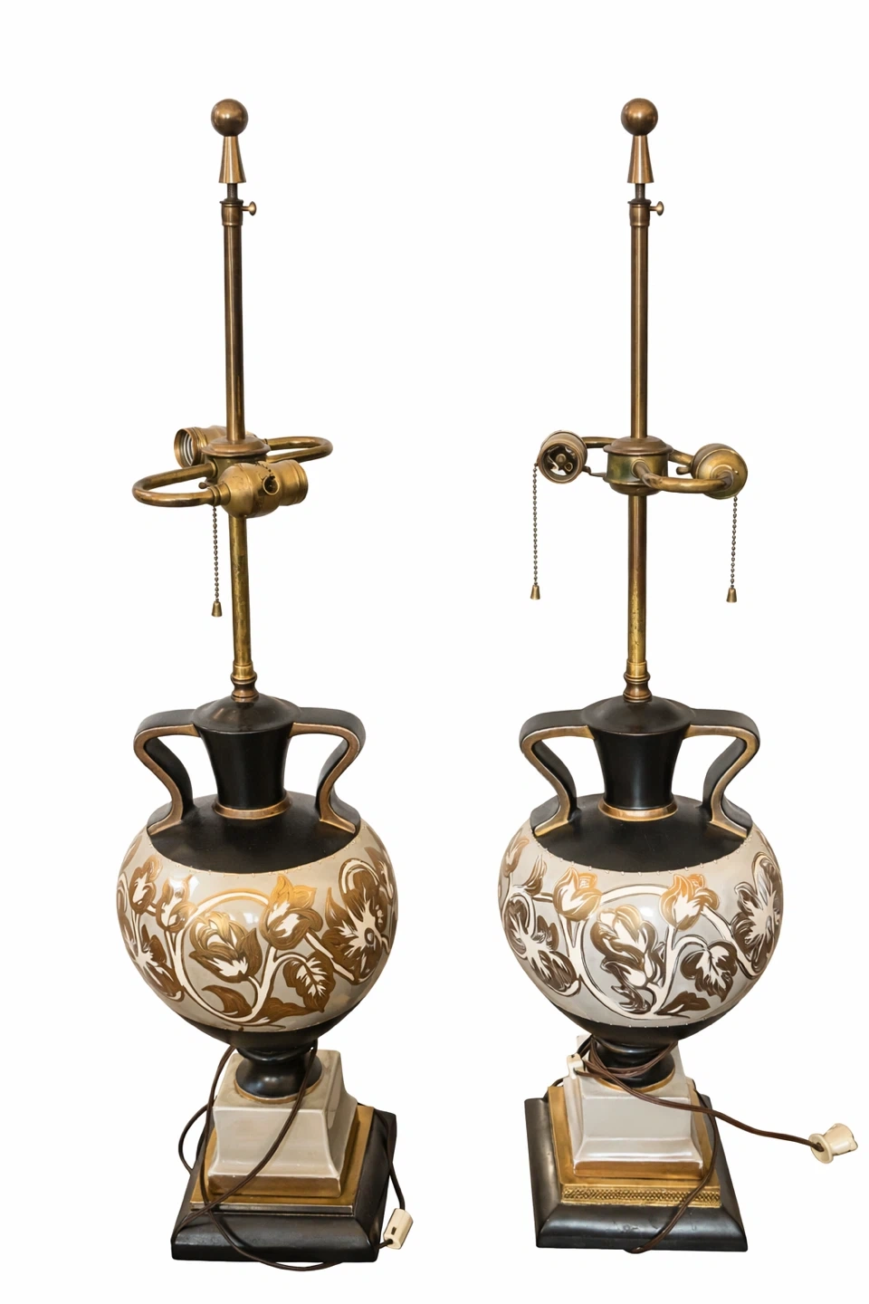 This is a pair of vintage table lamps. They have a decorative ceramic base with a gold floral pattern. Each lamp has a brass stem and finial. One lamp has a pull chain, the other does not. They are a bit heavy. Mid century. Decorative or repurpose.