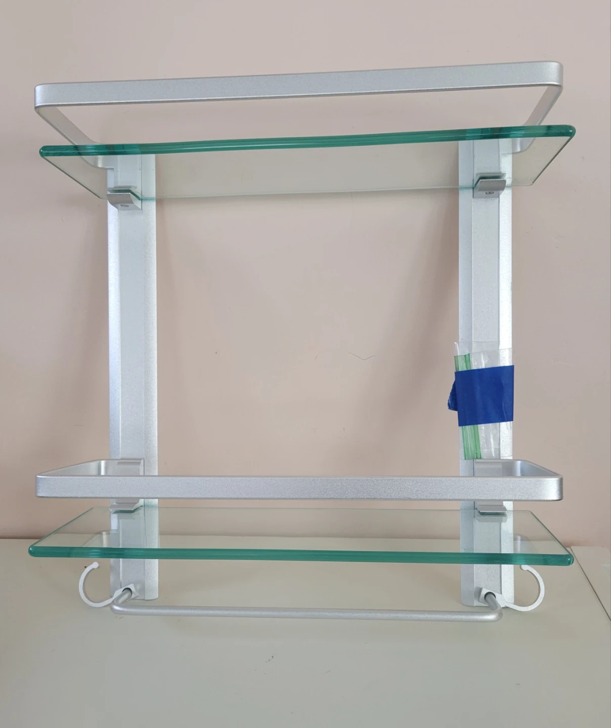 This wall-mounted shelf unit features two glass shelves and a towel bar. Its modern design is suitable for bathrooms or kitchens. Aluminum frame and glass construction.