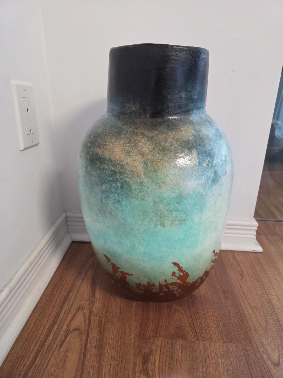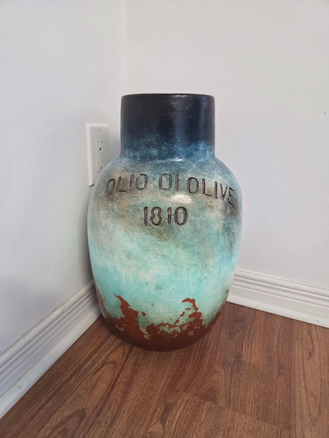 This is a decorative vase with 'Olio Di Olive 1810' text. It features a gradient of blue, green, and brown colours. It's a unique italian-style piece for inside or outside decor. 18 inches tall, 35 inches diameter (middle), 6 inches diameter (mouth). Vintage look.