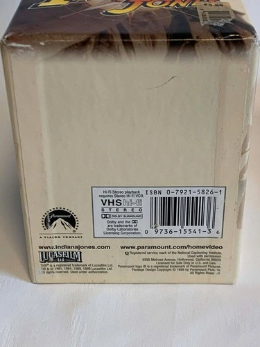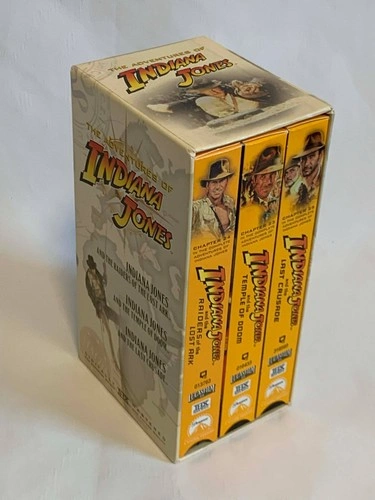 See photos for condition. The inner VHS tapes are in great shape. The outside shell has minor rips from stickers on one side, but is still in very nice shape. This is the complete The Adventures of Indiana Jones VHS box set featuring all three original films: Raiders of the Lost Ark, The Temple of Doom, and The Last Crusade. Each tape has been digitally remastered for THX sound and picture quality, ensuring a superior viewing experience. A perfect addition for any Indiana Jones fan or collector of vintage media. Key Features: Main Character(s): Indiana Jones (played by Harrison Ford), Publisher: Paramount / Lucasfilm, Universe: Indiana Jones Series, Release Year: Approx. 1990s, Cover Type: Sturdy cardboard box with individual VHS cases for each movie, Special Features: Digitally remastered for THX sound and image quality.