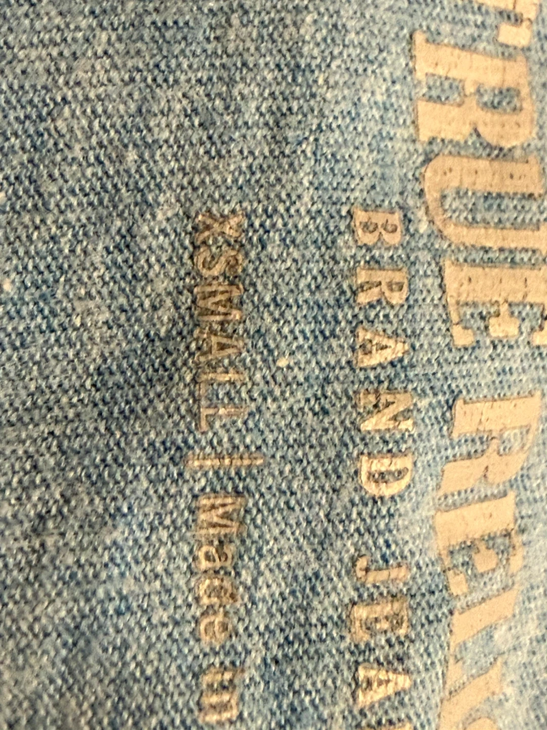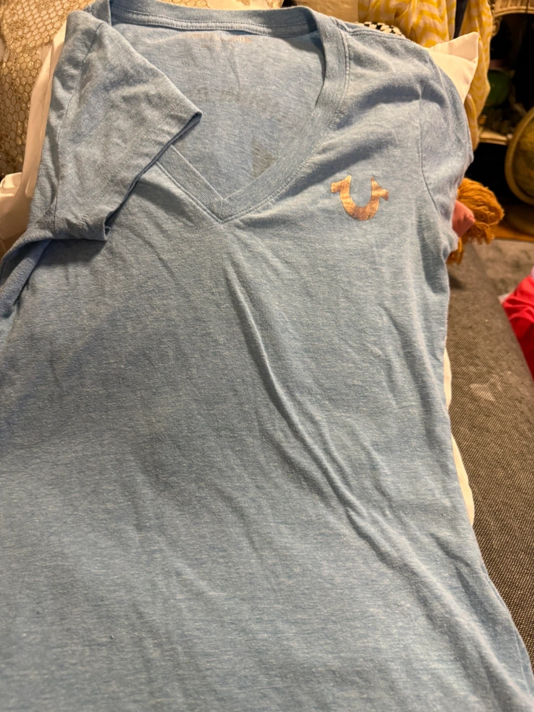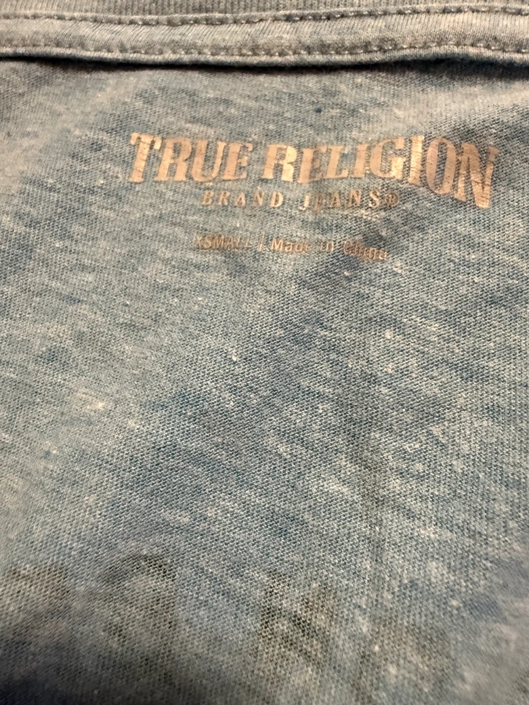 Light blue V-neck t-shirt with True Religion horseshoe logo on the front left chest and large circular logo on the back. Size XS. Made in China.