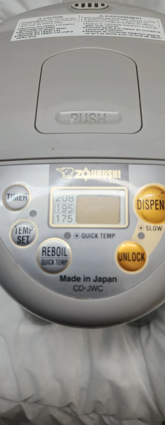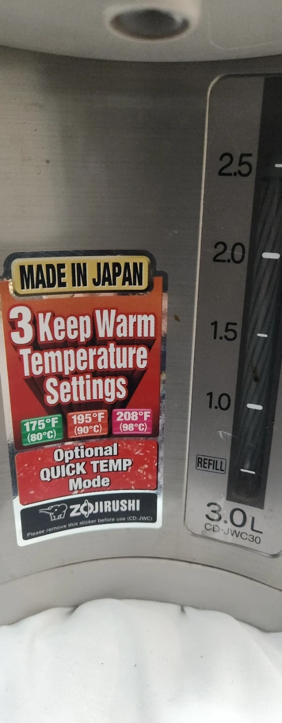 This Zojirushi electric water boiler features three keep-warm temperature settings: 175°F (80°C), 195°F (90°C), and 208°F (98°C). It also offers an optional Quick Temp mode. Made in Japan. 3.0L capacity.