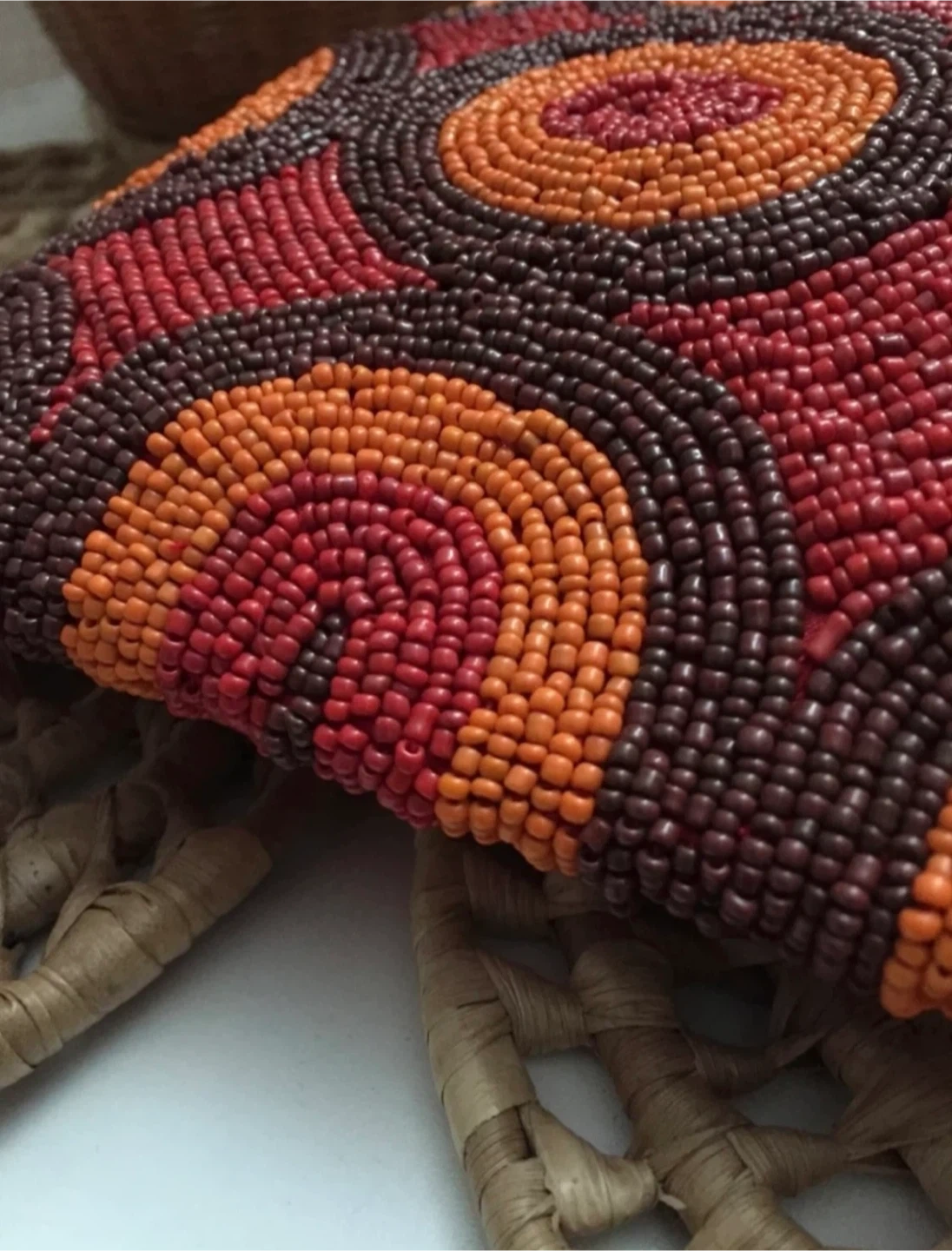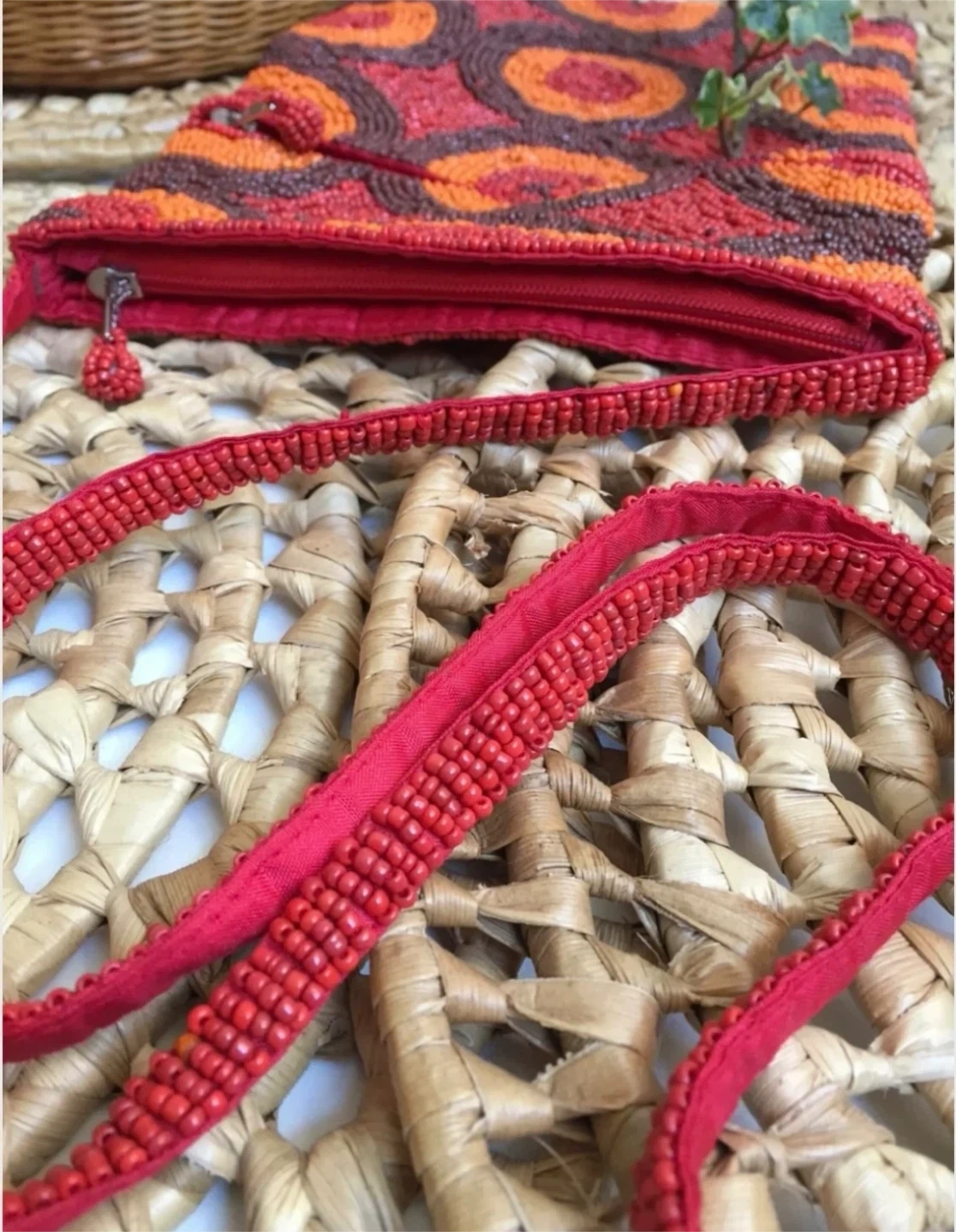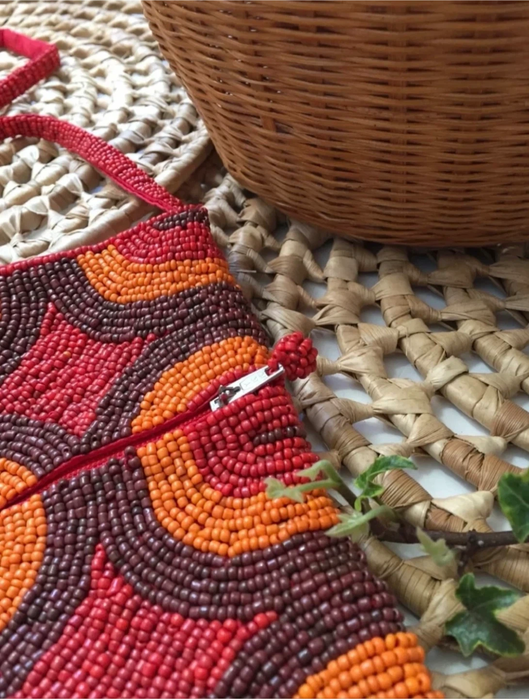 •This beautiful handmade beaded bag features a vibrant circle pattern in red, orange, and brown. It has a secure zipper closure and a matching red beadwork construction strap.
