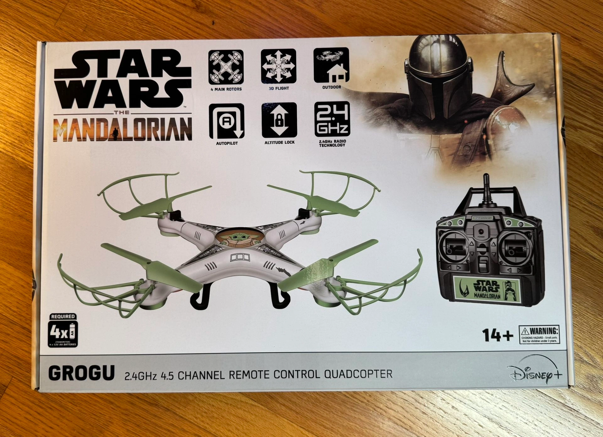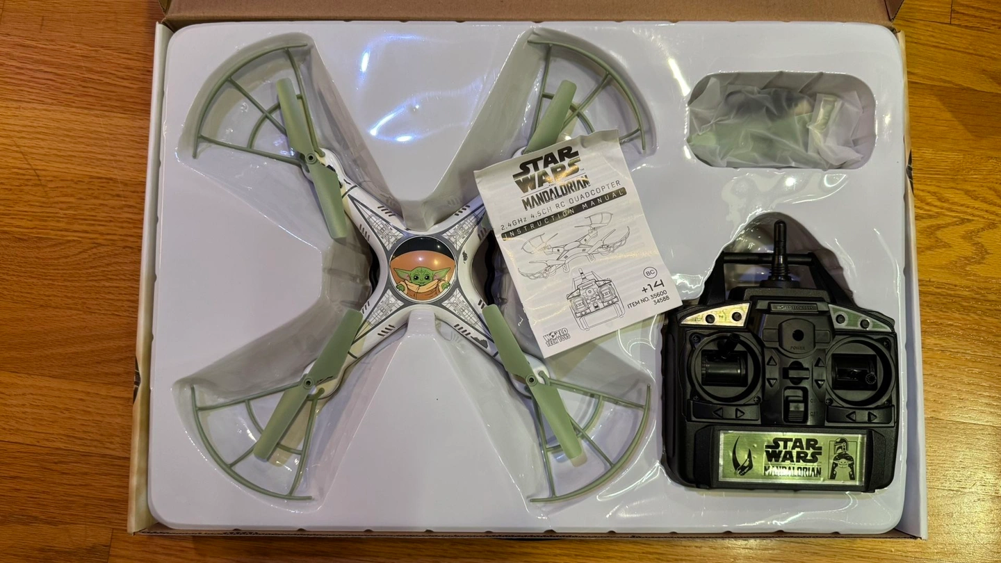 This Star Wars The Mandalorian Grogu RC Drone is ready to fly! It features a 2.4GHz transmitter, removable rotor guards, and a 4.5 channel built-in gyro for multi-dimensional flight. It has a durable, lightweight body with speed control and fun flip stunt modes. Includes the drone, rechargeable battery, transmitter, USB charging cable, 4 spare rotor blades, screwdriver, and manual. Dimensions are 12.50 x 12.50 x 2.75 inches. Transmitter requires 4 AA batteries (not included). This drone is open but has NEVER been used. Local pickup in the UIC area.