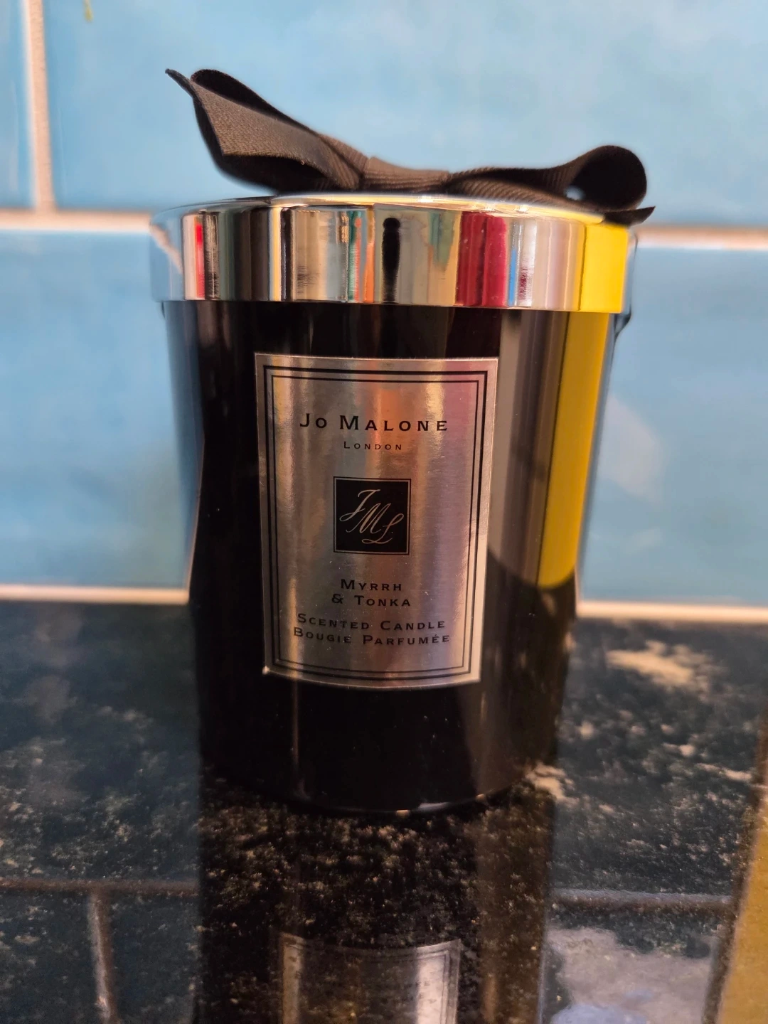 Selling a Jo Malone Myrrh & Tonka scented candle! The height is 2.5 inches or 6.35 cm. It smells amazing and would be perfect for creating a relaxing atmosphere in your home.