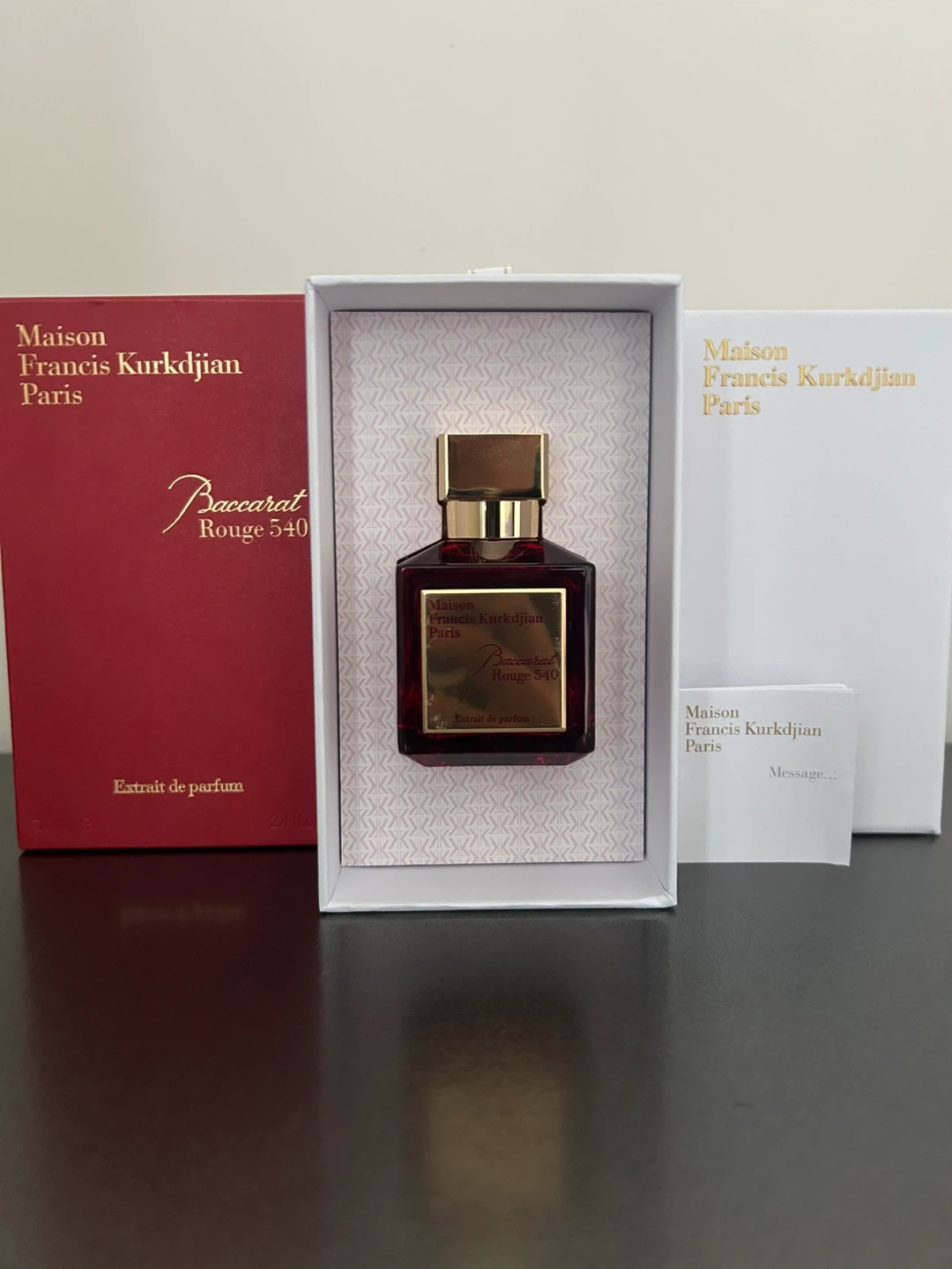 This is the Maison Francis Kurkdjian Baccarat Rouge 540 Extrait de Parfum. It comes in a distinctive red bottle with a gold cap. The fragrance is housed in its original box.