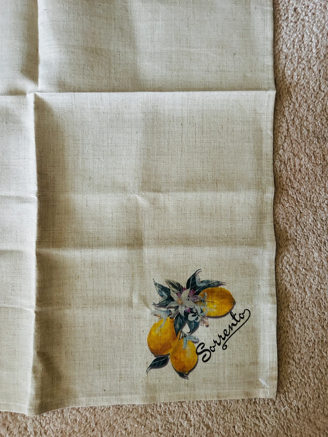 This tea towel features a lovely lemon illustration with the word 'Sorrento' script. It's made from 100% LINEN material. Perfect for adding a touch of Mediterranean flair to your kitchen!