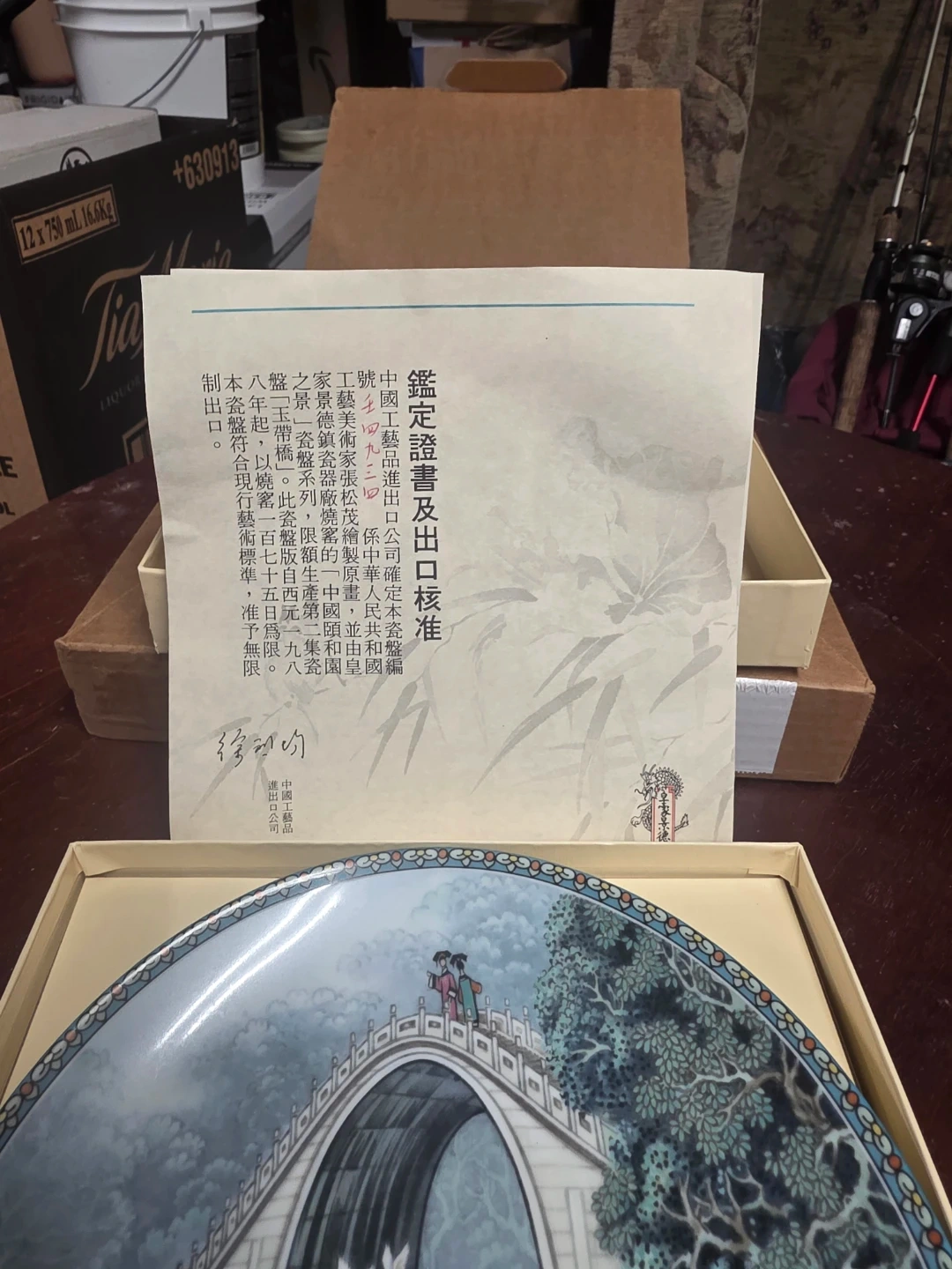 This decorative plate features a scenic design of a bridge with figures and flying cranes. It includes a certificate of authenticity. It's a beautiful piece for display.