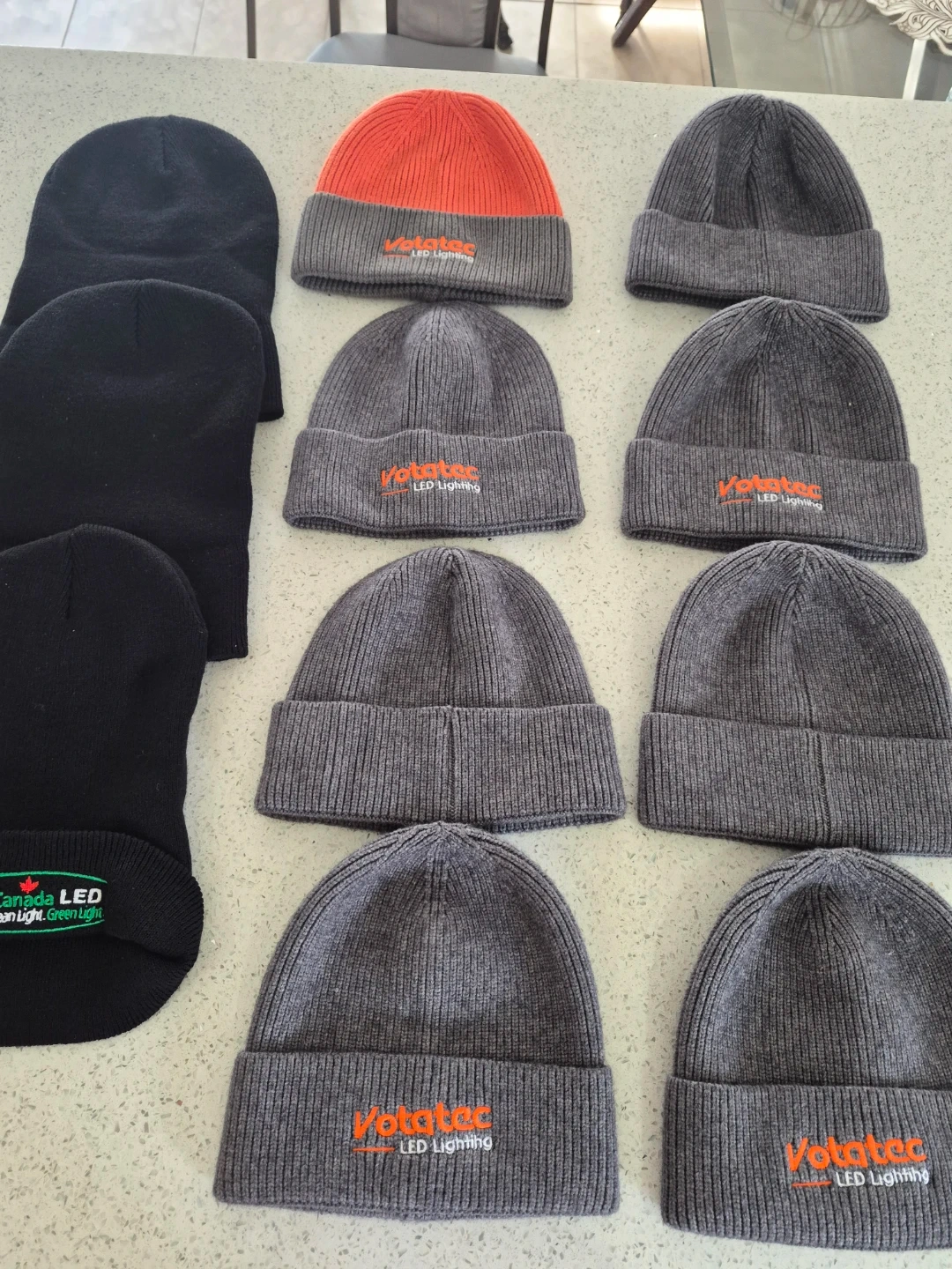 These toques are made with 70% wool and 30% acrylic. They're great for keeping warm! Multiple colours available: black, grey, and orange. The logo at the front says Votatec